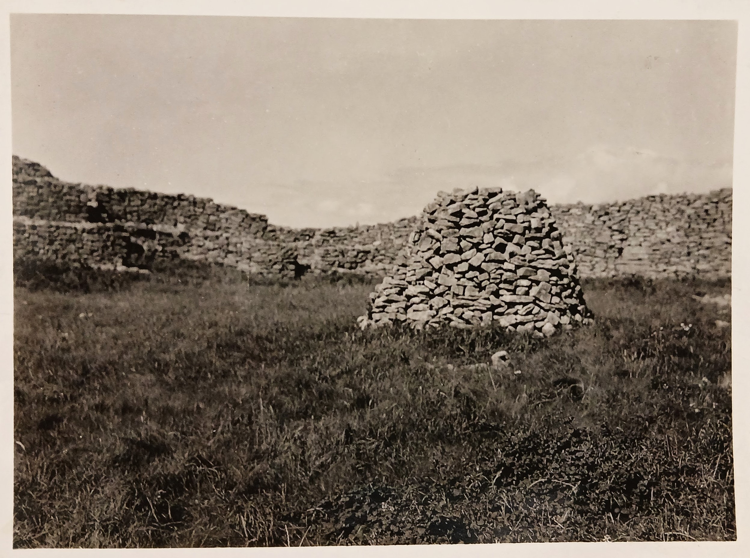 An image of a cairn on Inishmaan (Inis Meáin), one of the Aran Islands off County Galway. A manuscript annotation on the reverse reads ‘Cairn inside a fort at Inishmaan’.