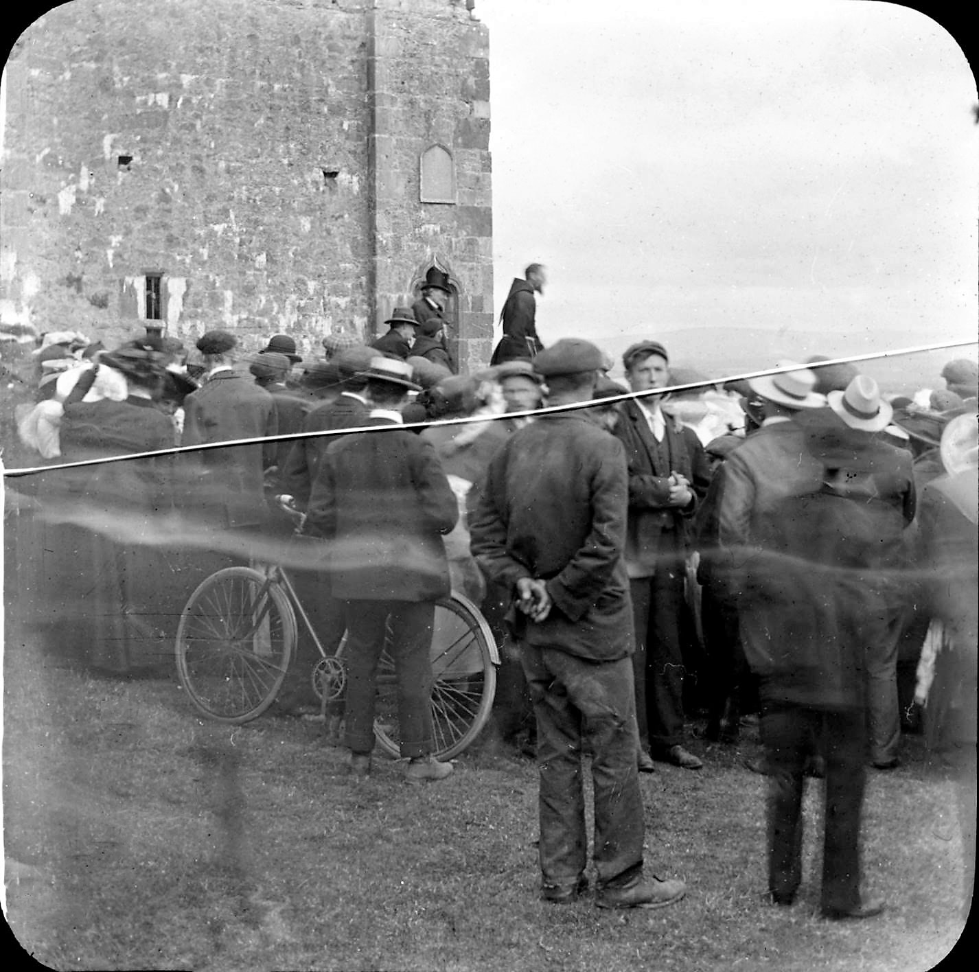 A view of a Capuchin friar preaching to a large crowd assembled in front of what appears to be a ruined castle.