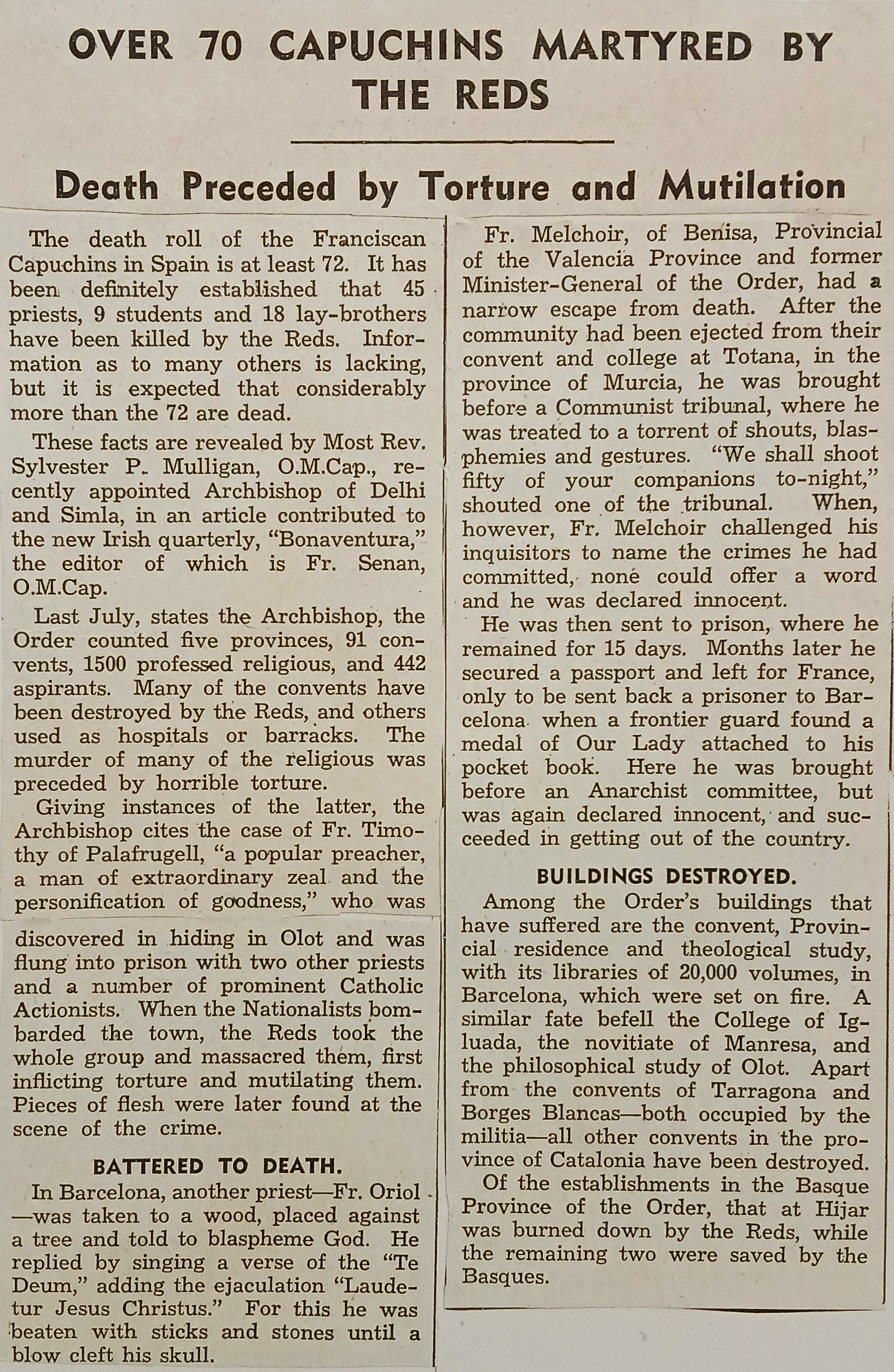 A clipping of an article citing an article by Archbishop Sylvester Mulligan OFM Cap. on the over seventy Capuchin friars who were murdered during the Spanish Civil War. Archbishop Mulligan’s article was published in the first issue of ‘Bonaventura’. The article was published in ‘The Advocate’ in Melbourne, Australia (22 July 1937).