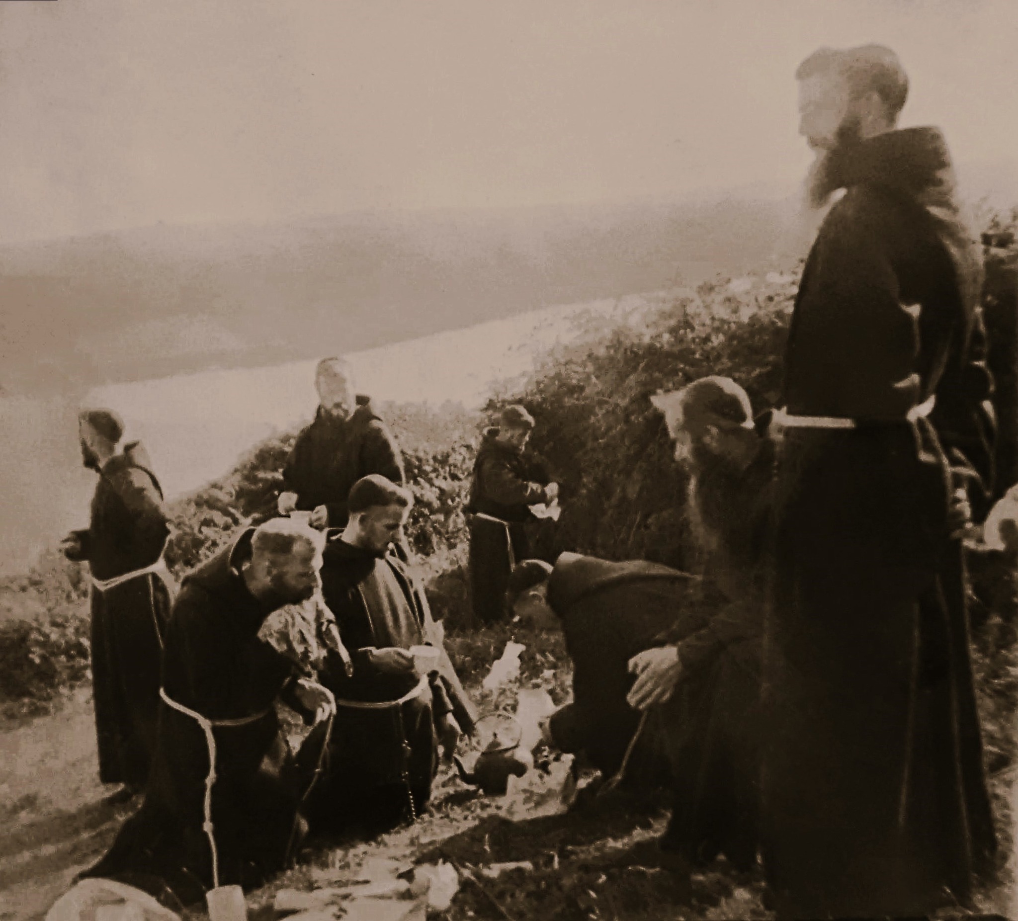A photograph of a group of Capuchin friars having tea and a picnic during outing in the countryside around Rochestown in County Cork.