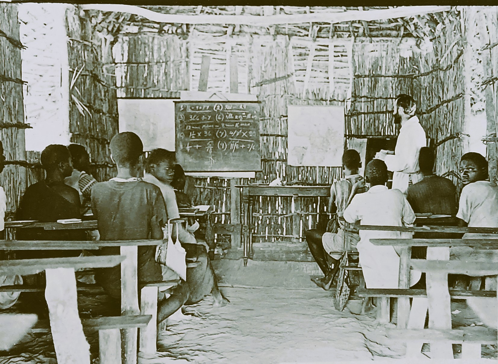 A Capuchin friar teaching mathematics to local school children in rural Northern Rhodesia (now Zambia).