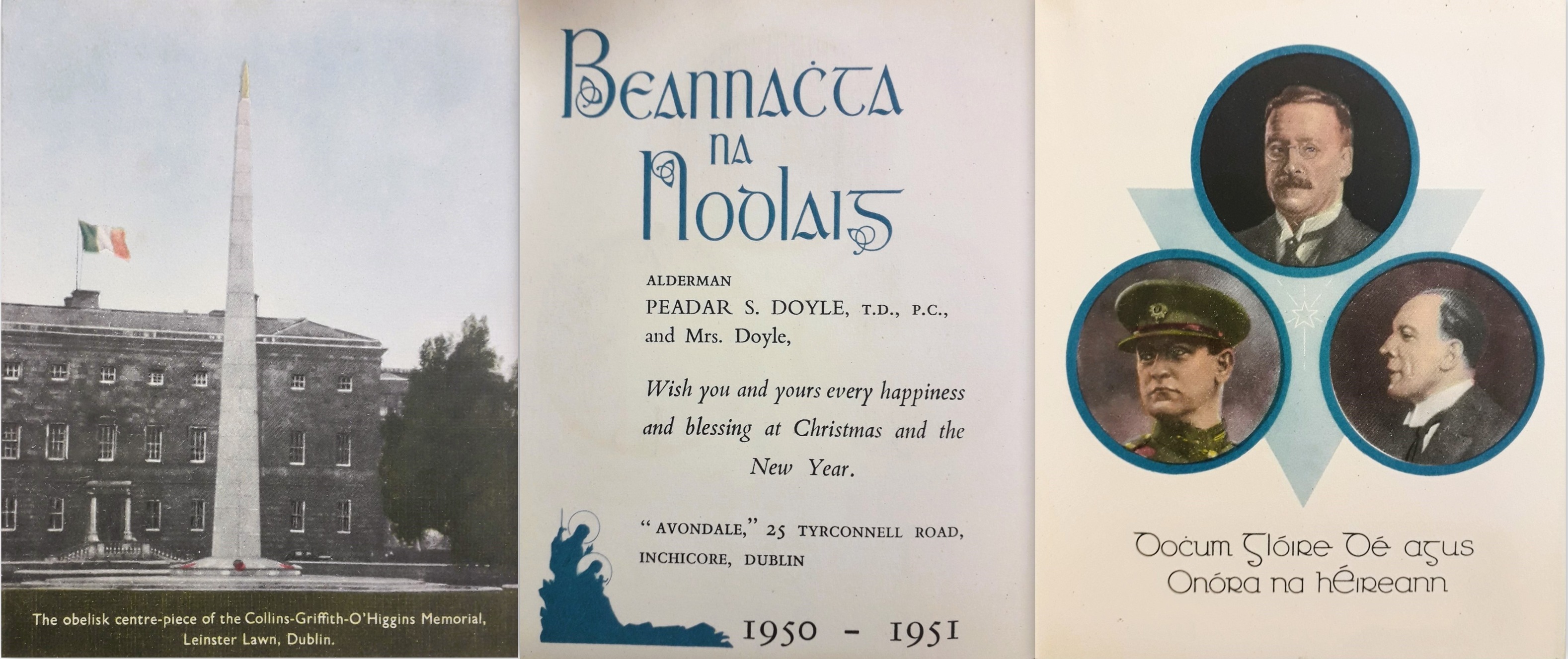 A Christmas greeting card from Peadar Seán Doyle, a Fine Gael Teachta Dála. The card shows the then recently unveiled eighteen-meter-high granite obelisk on Leinster Lawn on the Merrion Square side of Leinster House, the seat of the Oireachtas or parliament of Ireland. The obelisk (designed by the OPW architect Raymond McGrath) commemorated Arthur Griffith, the President of Dáil Éireann, Michael Collins, the revolutionary leader, and Kevin O’Higgins, a leading Irish Free State minister who was assassinated in 1927.