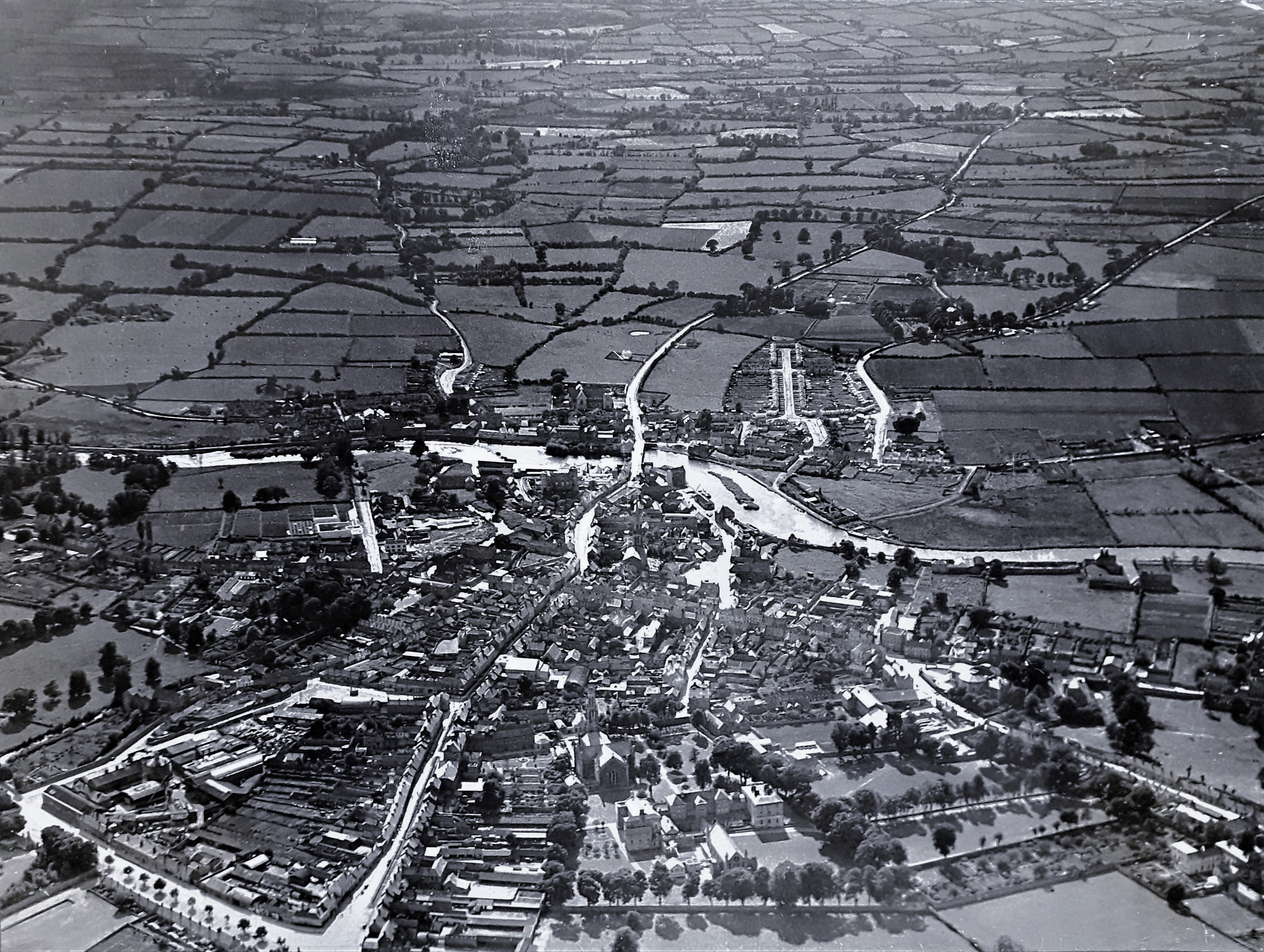 An aerial view of Carlow Town in about 1945. Prominent buildings in the image include (in the foreground) the Cathedral of the Assumption. Work on this Gothic-Revival style building commenced in 1828 and it was completed in 1833. The cathedral’s 151 feet (46 metre) spire is a conspicuous landmark in the town. Adjacent to the cathedral is St. Patrick’s College, a former seminary for the diocese of Kildare and Leighlin, and now a liberal arts and humanities college for lay students. The English-born architect Thomas Alfred Cobden (1794-1842) was responsible for the design of the college’s south wing (1817-1819) and north wing (1821-1835) and later the adjoining cathedral. Near the River Barrow adjoining Wellington Bridge (better known as Graiguecullen Bridge) are the ruins of Carlow Castle.