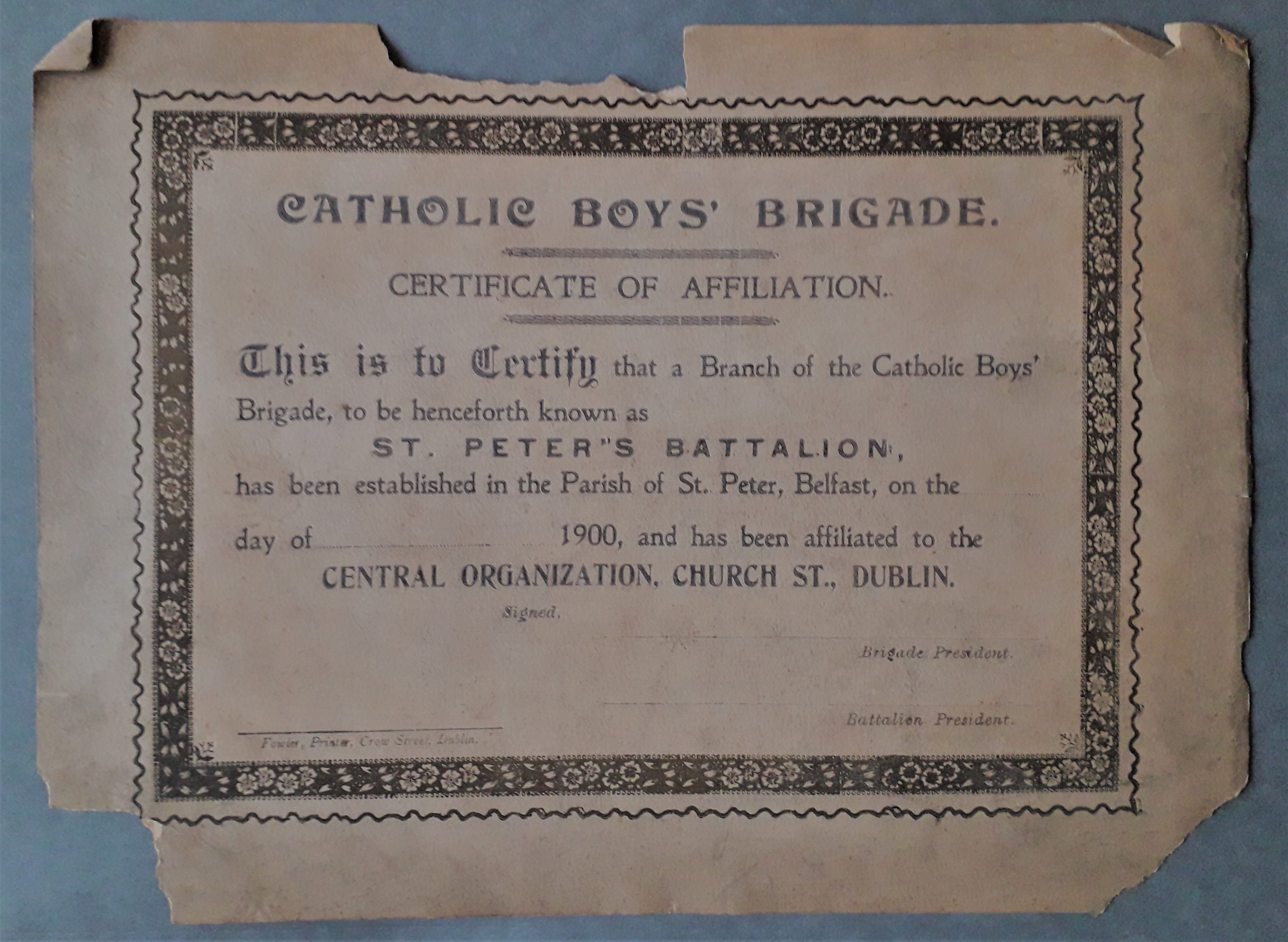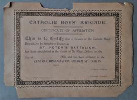 A blank notice of affiliation certifying that a branch of the Catholic Boys’ Brigade, known as ‘St. Peter’s Battalion’, has been established in the Parish of St. Peter’s, Belfast. The certificate notes that the battalion has been affiliated to the central organisation at Church Street, Dublin.