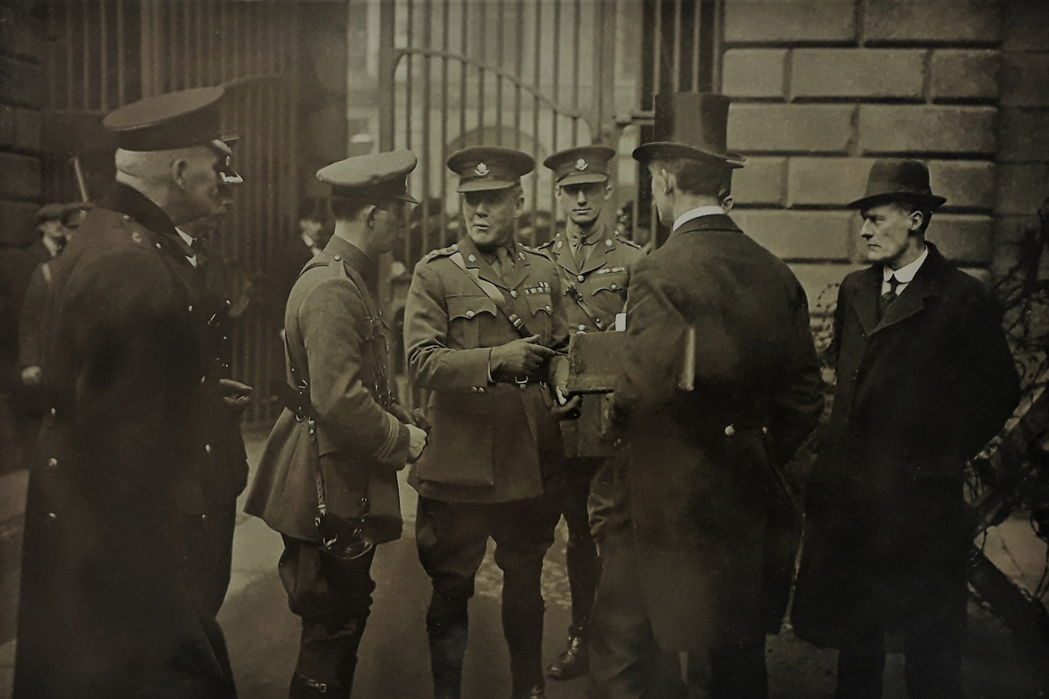 A photograph an Irish National Army officer (identified as ‘Captain Heaslip’ in the original caption) conversing with a Major in the Worcestershire Regiment as the former prepares to assume guard duties at the Bank of Ireland building on College Green in Dublin. This was one of several significant public handovers from the British administration to the Provisional Government during 1922. The event was noteworthy as it was first time that the historic Bank of Ireland building (prior to 1801 it housed the Parliament of Ireland) was guarded by non-British troops.