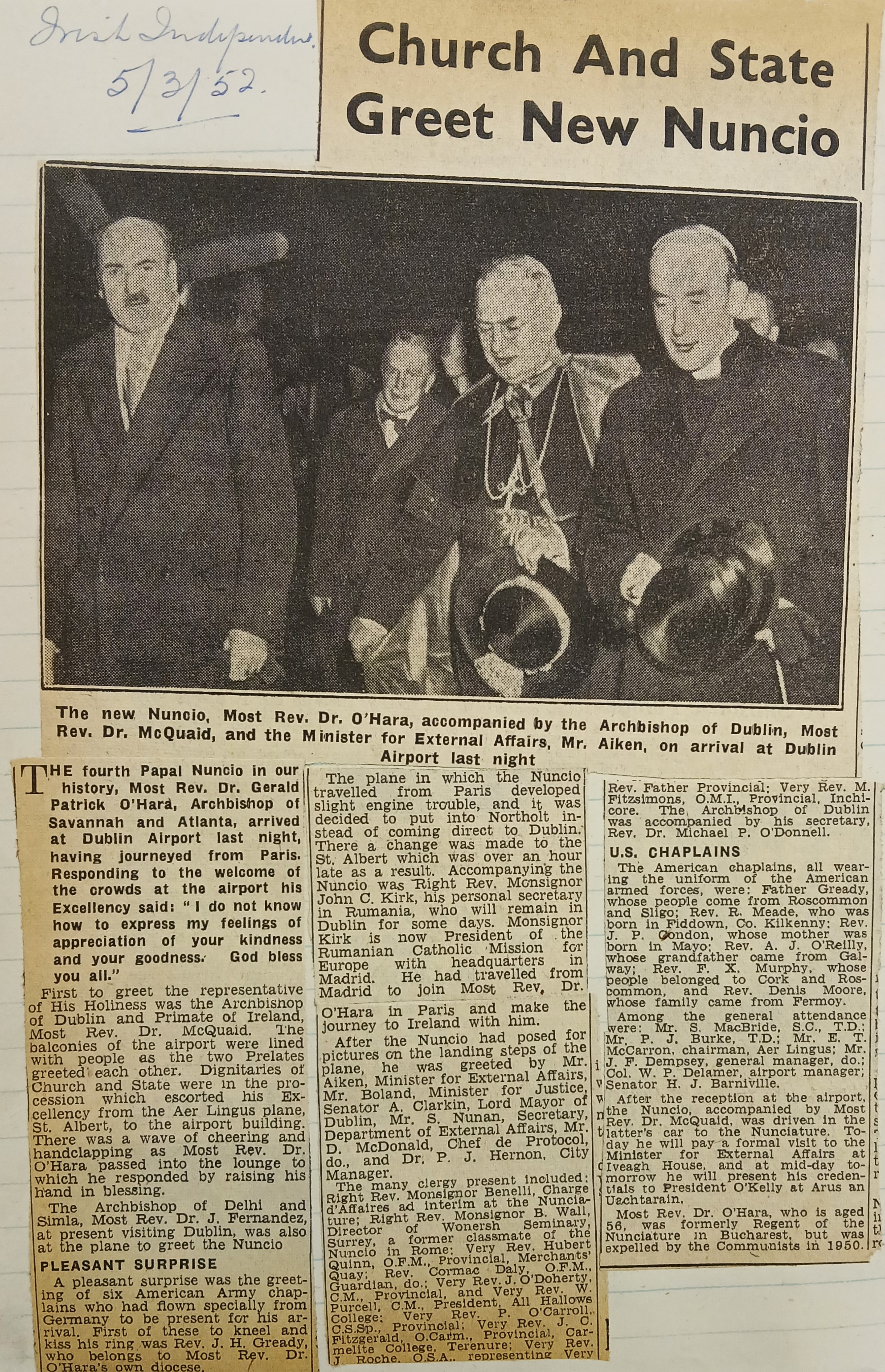 A clipping of an article reporting on the arrival of Archbishop Gerald O’Hara’s at Dublin Airport where he was greeted by Archbishop John Charles McQuaid and Frank Aiken, Minister for External Affairs. The clipping is taken from the ‘Irish Independent’ (5 March 1952).