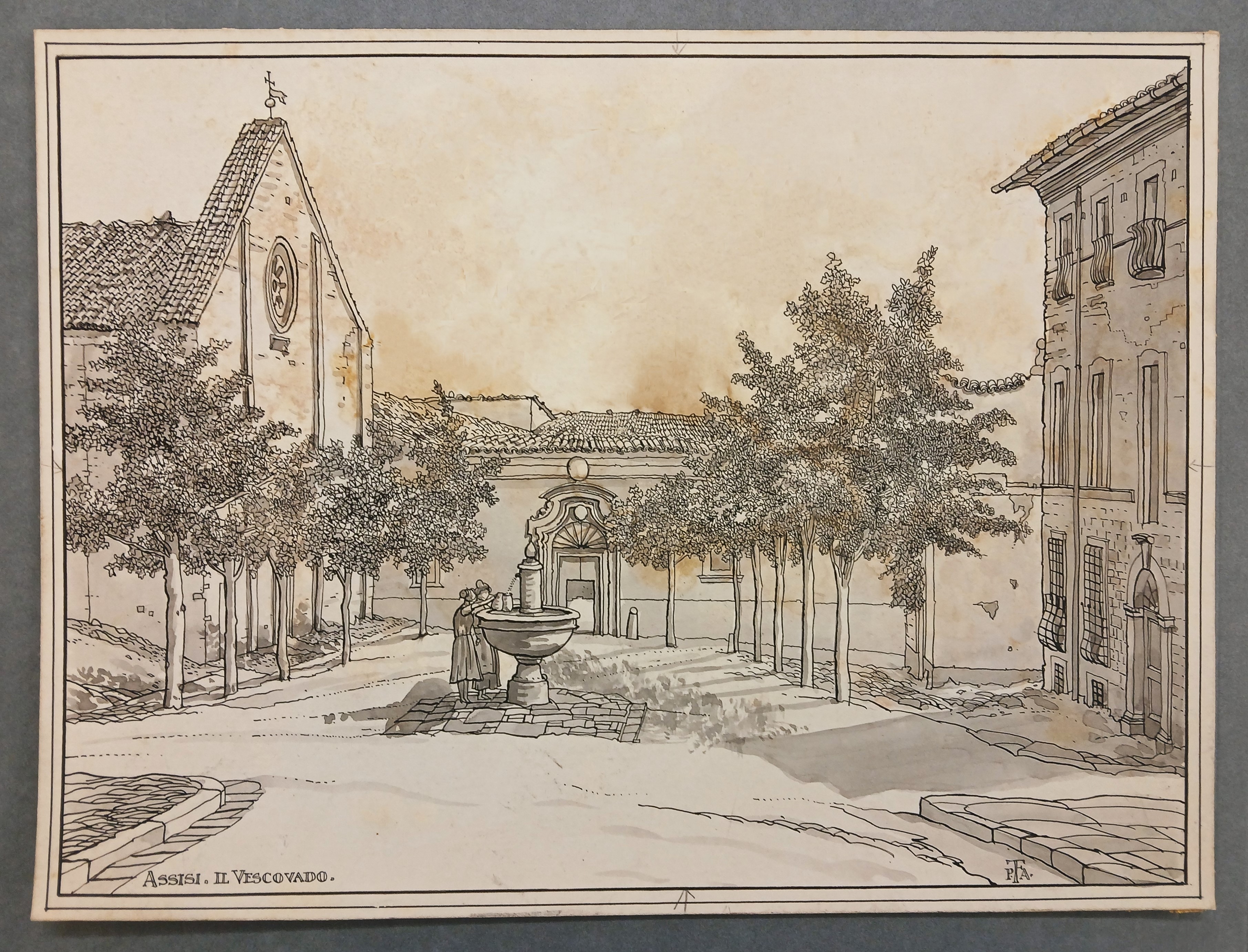 A drawing of the Church of Santa Maria Maggiore (Chiesa di Santa Maria Maggiore) in the Piazza del Vescovado in Assisi, Italy.