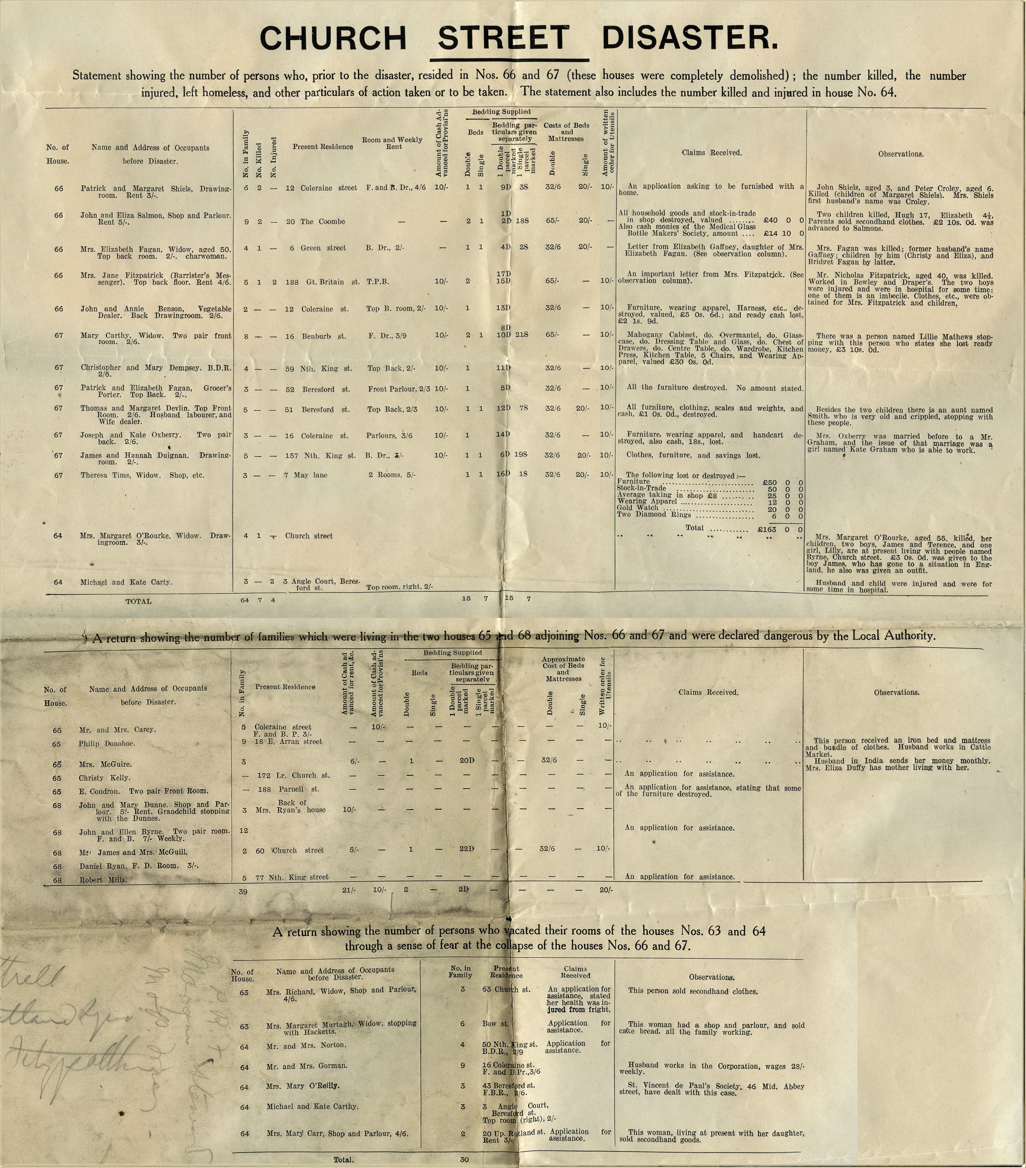 Schedules containing statements showing the ‘number of persons who, prior to the disaster, resided in Nos. 66 and 67 (the houses were completely demolished), the number killed, injured, and left homeless. The statement also includes the number killed and injured in house No. 64, and the amount of grants given’. Other schedules refer to the number of persons who vacated adjoining properties ‘through a reasonable sense of fear at the collapse of the houses 66 and 67 …’ and other relief actions to be taken.