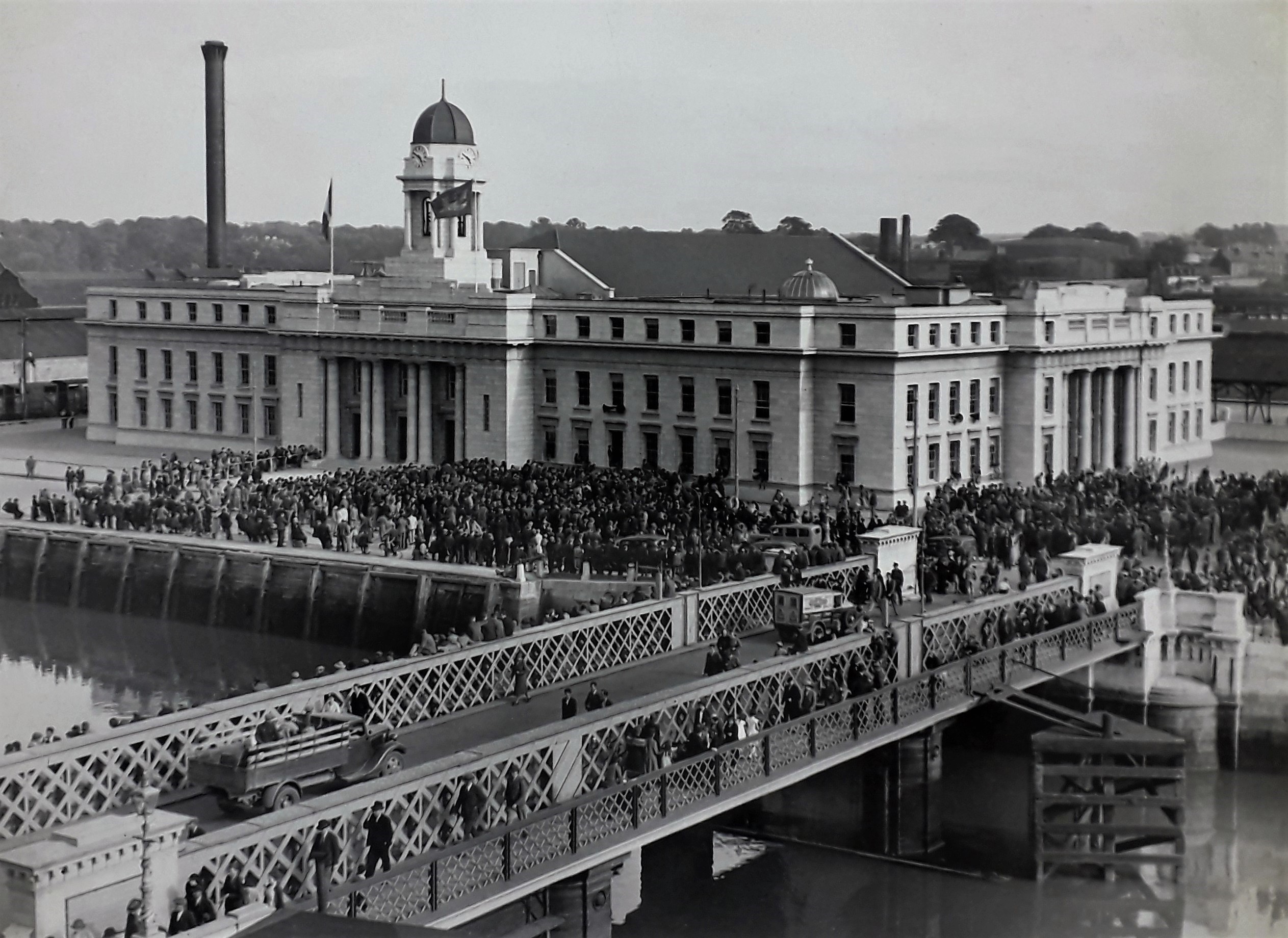A view of Cork City Hall taken from across the River Lee on South Mall in about 1940. A large crowd is assembled in front of the building.