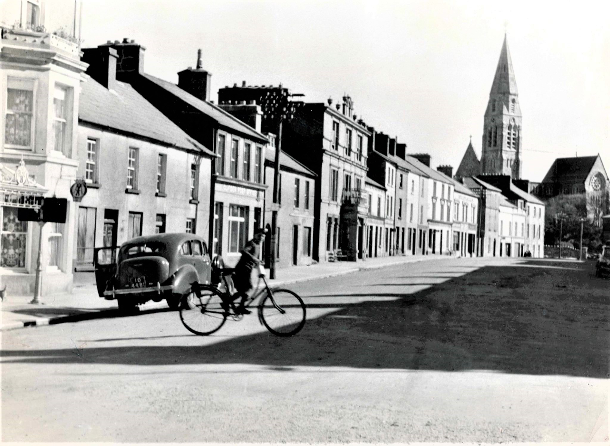 A view of the main street (looking towards St. Joseph’s Church) in Clifden, County Galway, in about 1950.