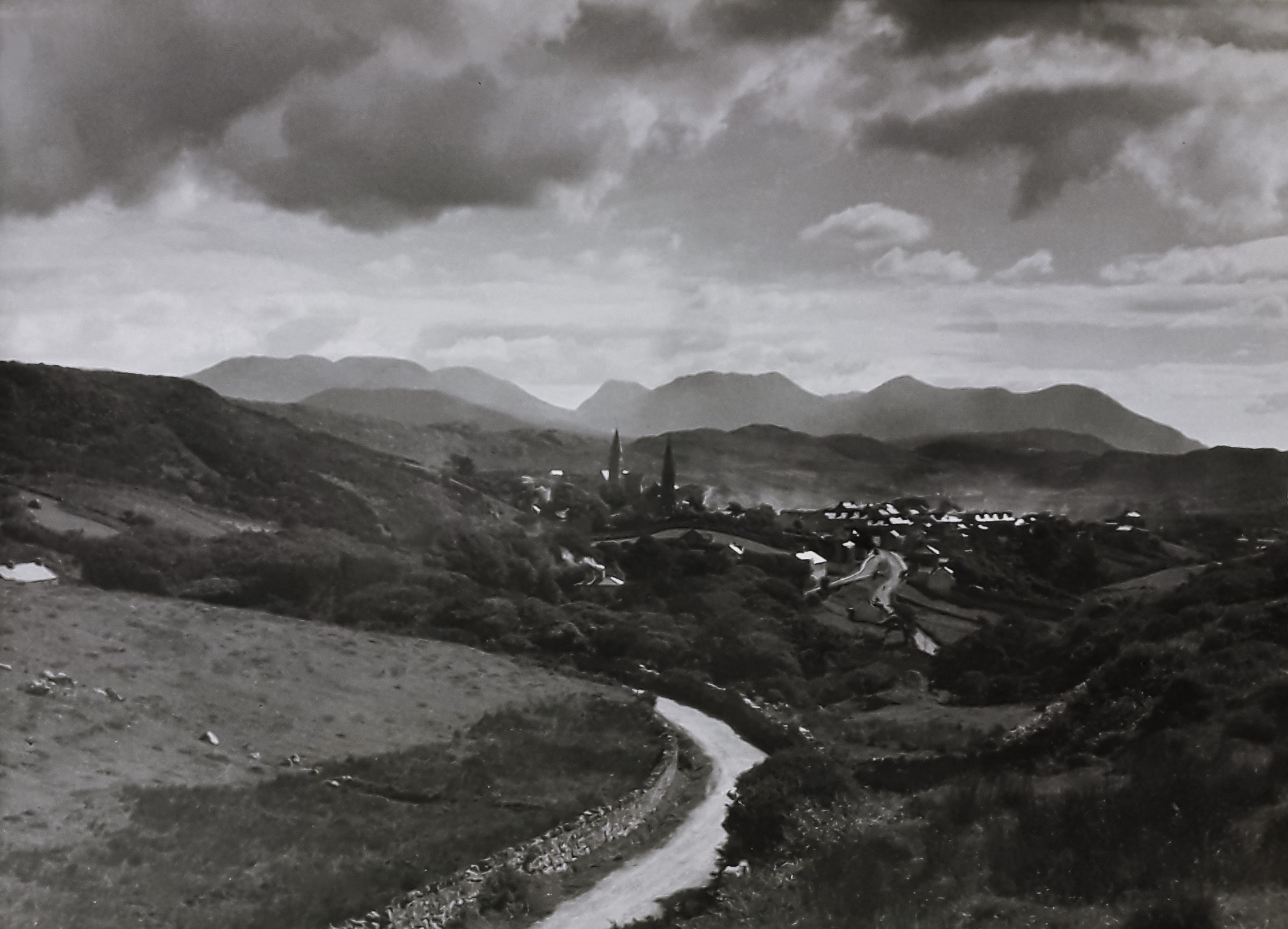 A general view of the town of Clifden in County Galway. A manuscript annotation on the reverse of the print reads 'Sunrise over Clifden'.