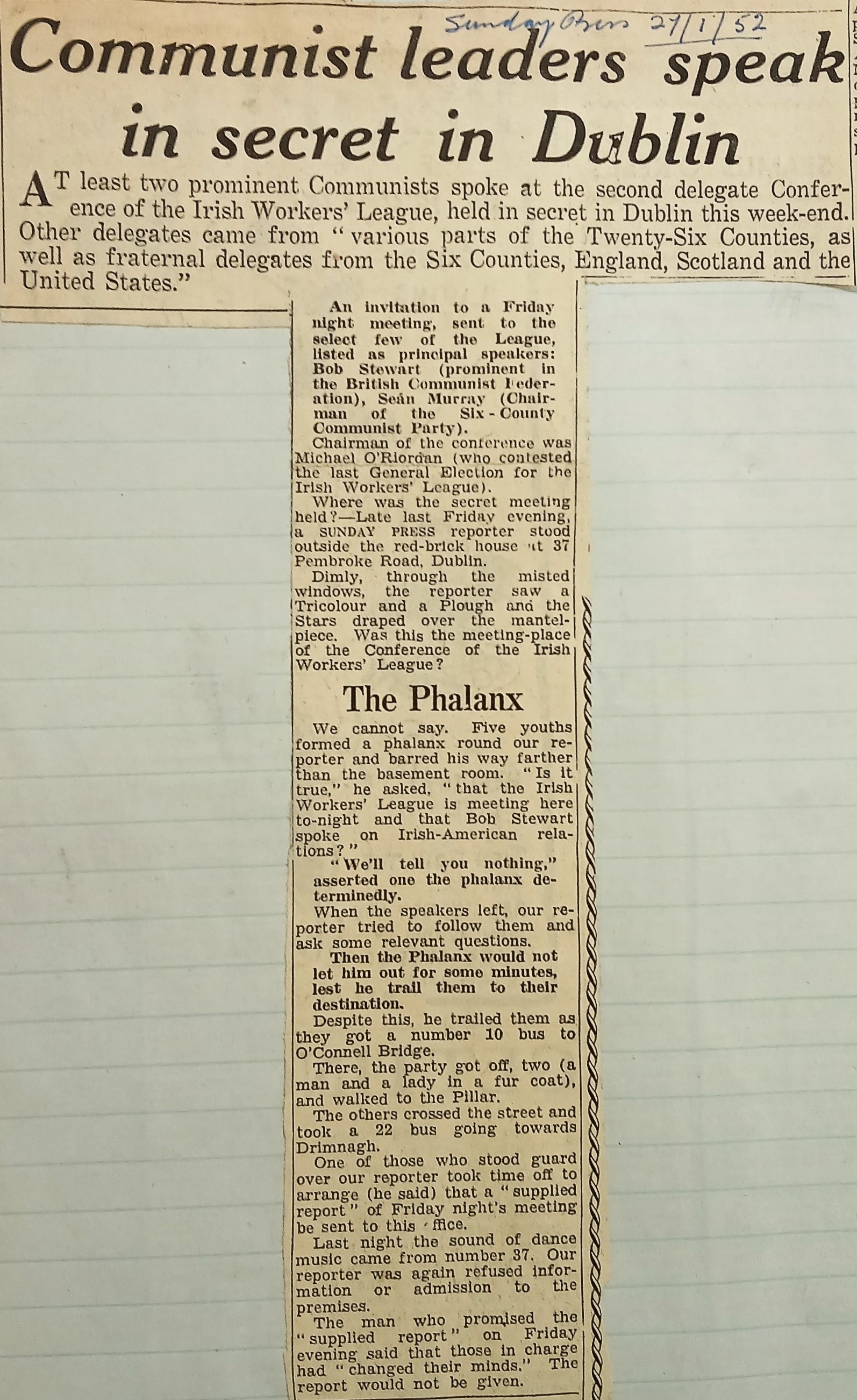 A clipping of an article claiming that two prominent communists spoke at the second delegate conference of the Irish Workers’ League held in Dublin. The clipping is taken from the ‘Sunday Press’ (27 January 1952).