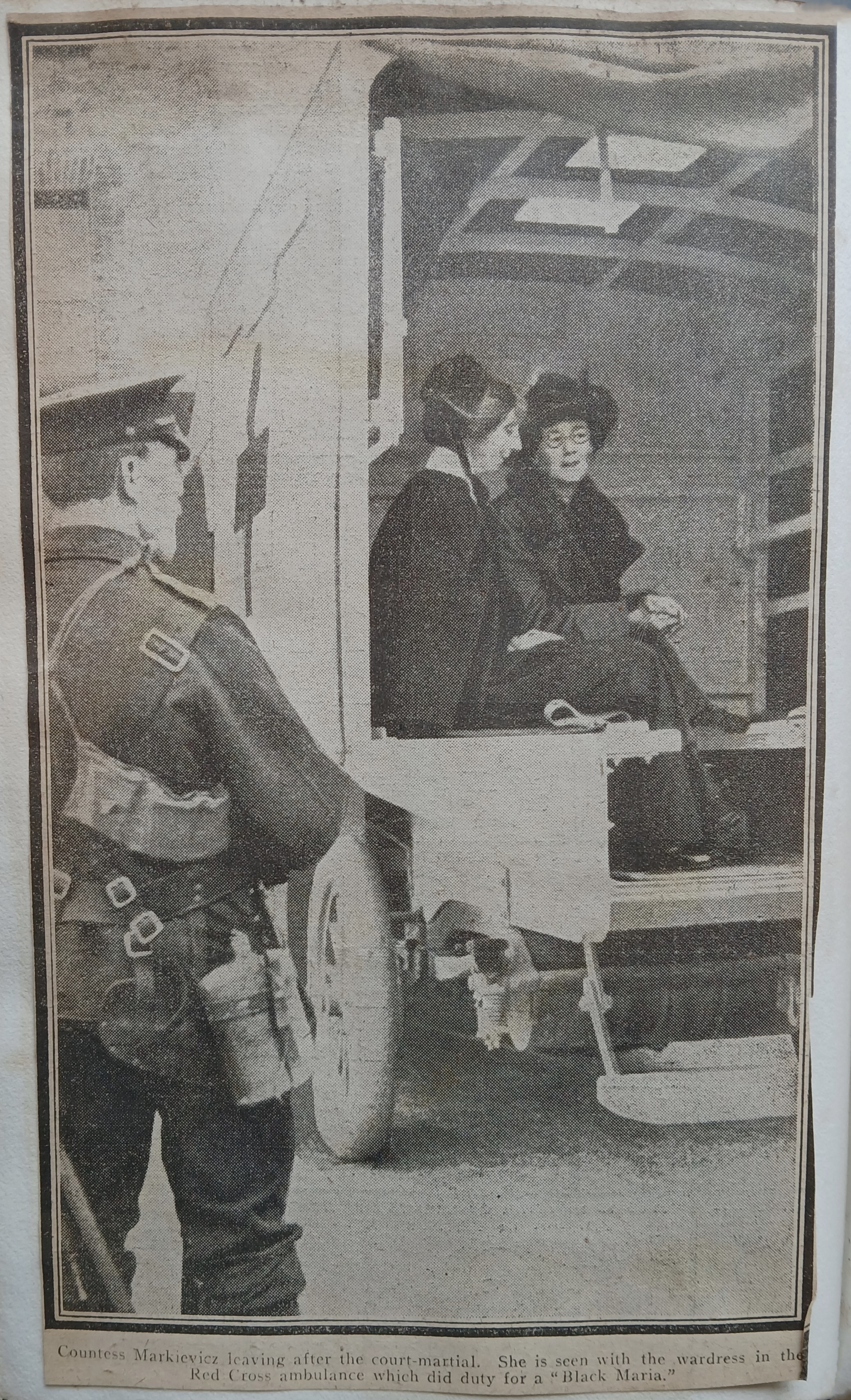 A clipping of an image of Constance Markievicz following her court martial. The caption notes that she ‘is seen with the wardress in the Red Cross ambulance which did duty for a “Black Maria”’. The newspaper title from which the clipping was taken is not given.