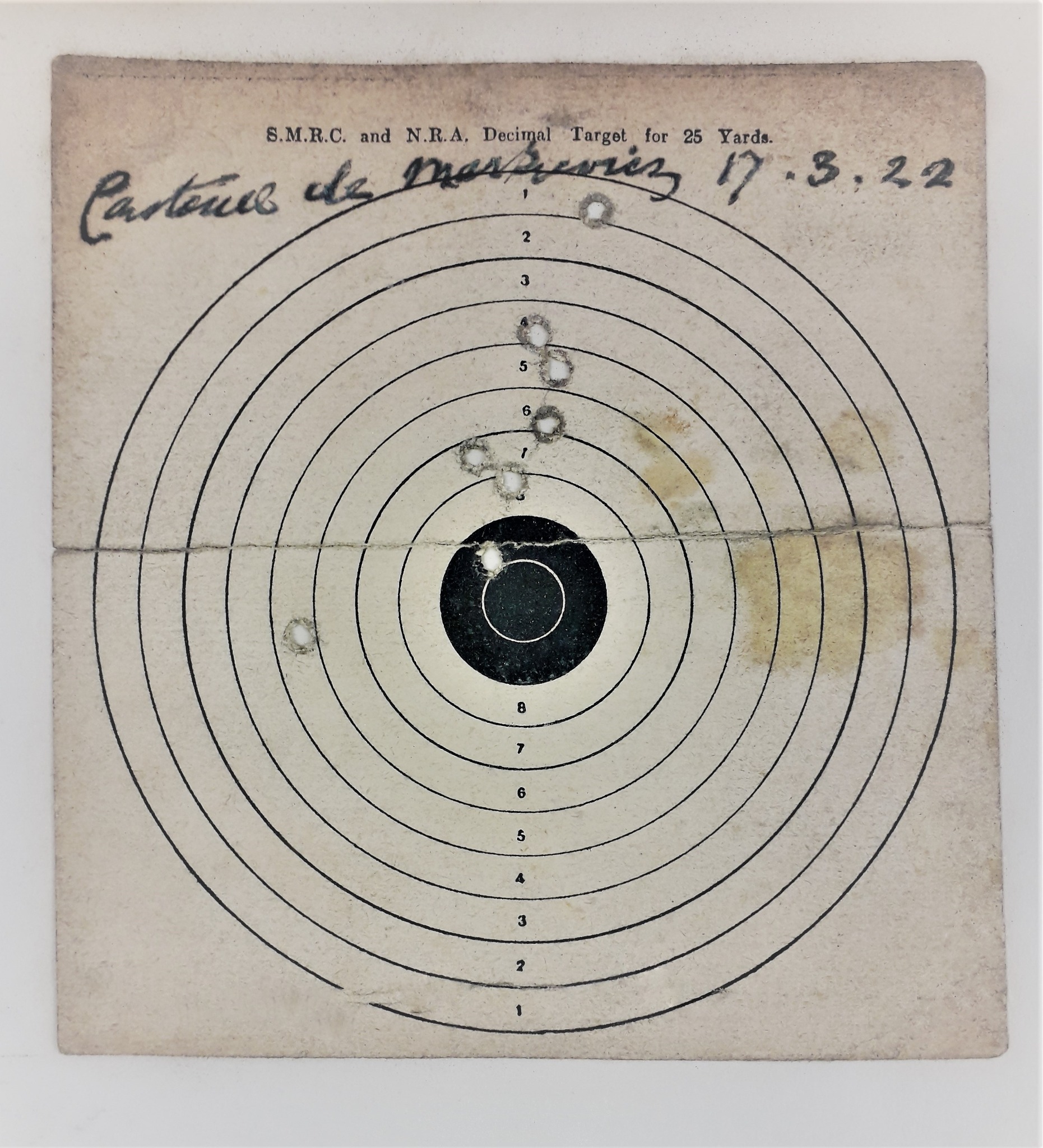 A printed target card signed ‘Constance de Markievicz’ and dated 17 March 1922. The target card was used at twenty-five yards distance and shows eight perforations.