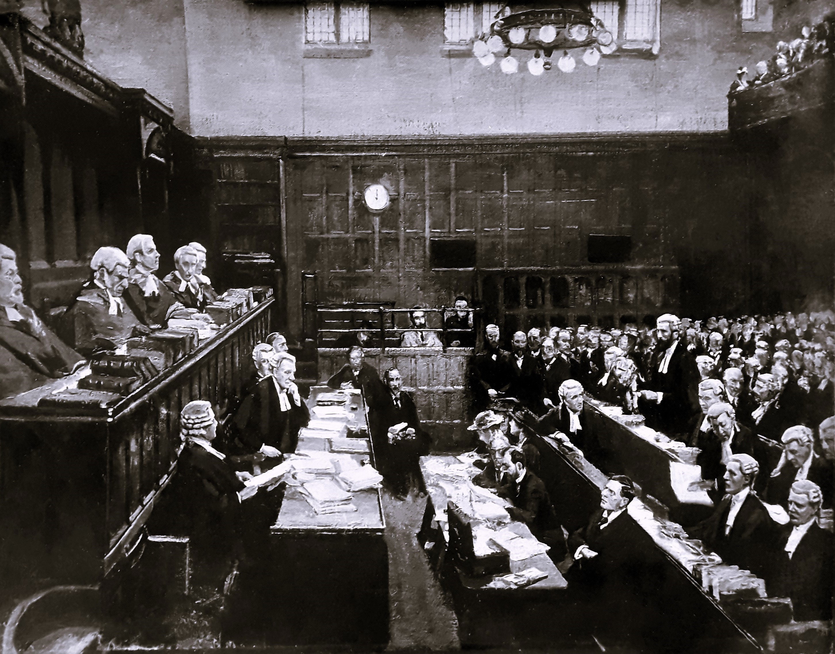 Photographic print of Sir John Lavery’s painting titled ‘High Treason: The Appeal of Roger Casement, The Court of Criminal Appeal, 17 and 18 July 1916’. A manuscript annotation on the reverse of the print credits the photograph to T.F. Geoghegan, 2 Essex Quay, Dublin.