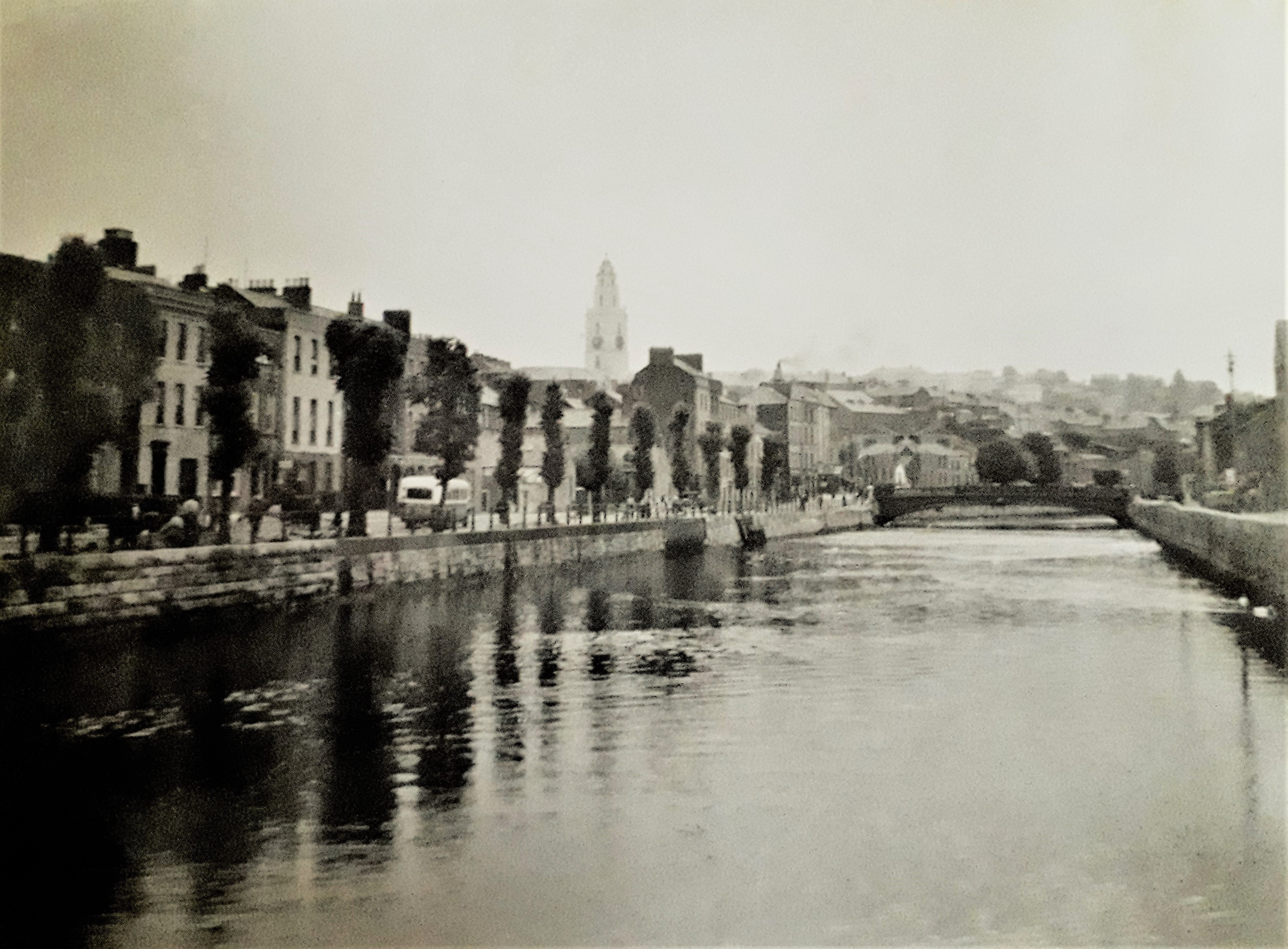A view of Farren's Quay and Pope's Quay in Cork in about 1945. The tower of the Church of St. Anne in the Shandon district of the city is visible in the image.