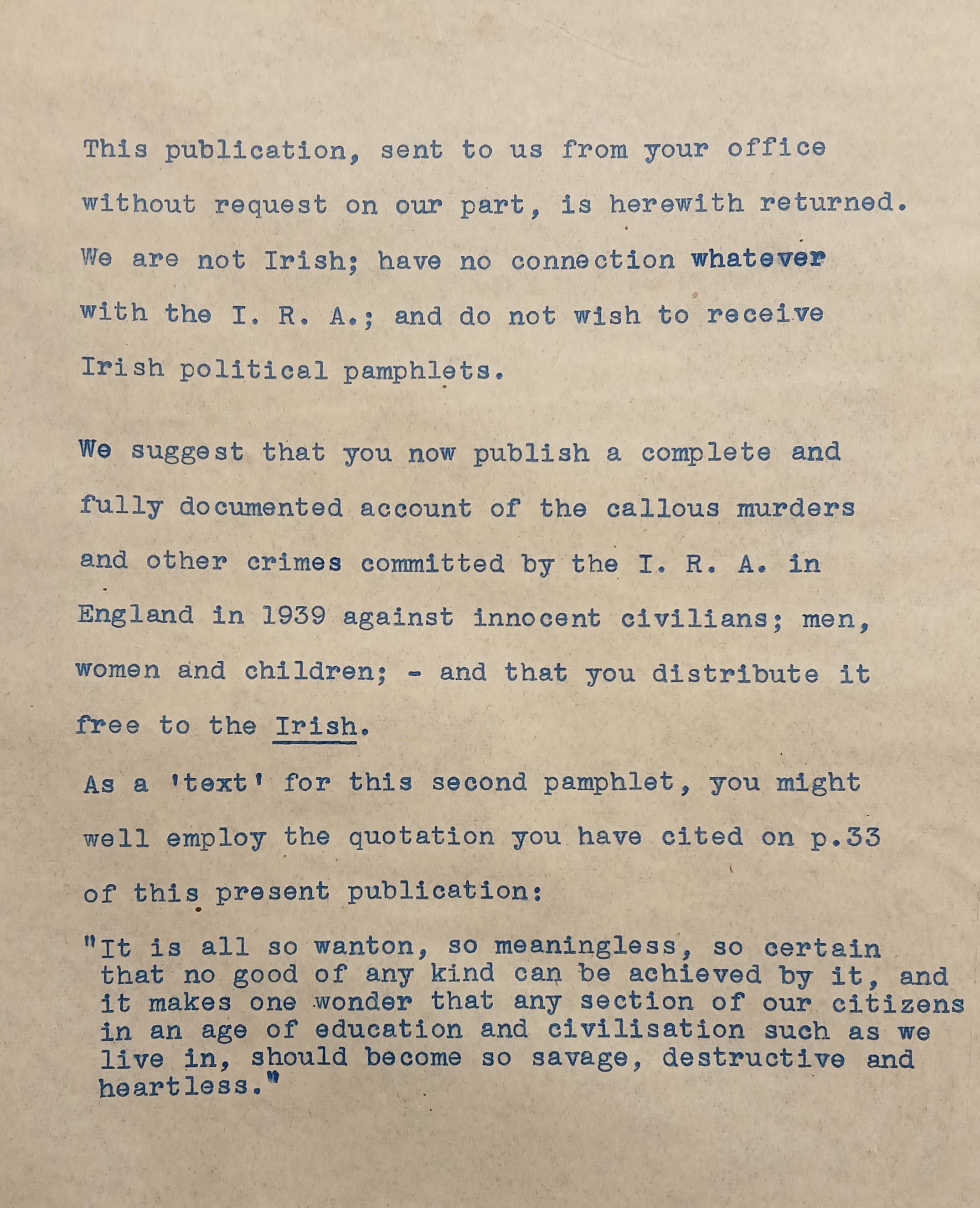 A note from an unnamed correspondent returning a copy of the ‘Orange Terror’ off-print. The correspondent complains that the item was sent to them ‘without request’ and asks that that ‘a complete and fully documented account of the callous murders and other crimes committed by the I.R.A. in England in 1939’ be distributed ‘free to the Irish’.