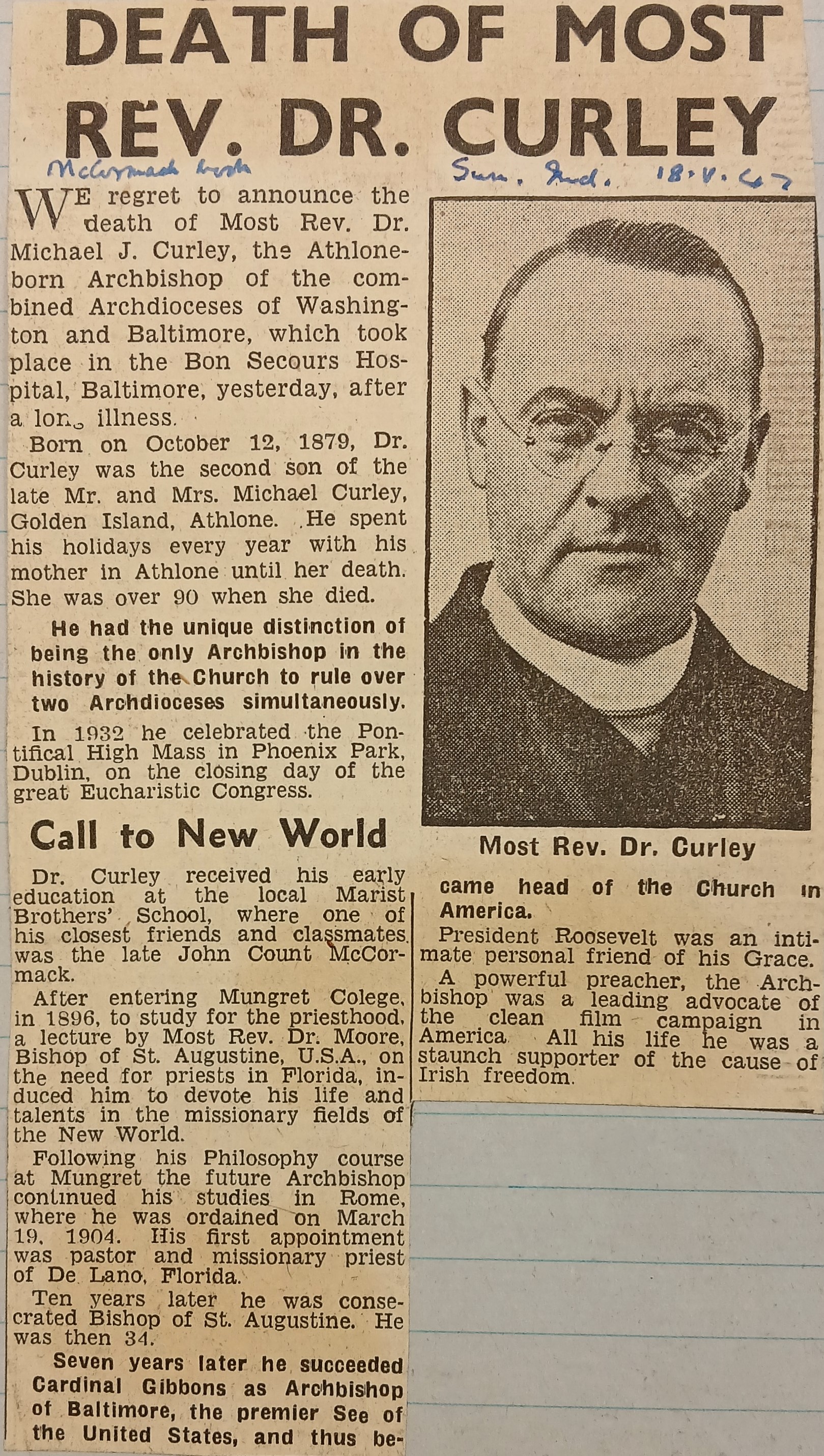 A clipping of an article on the death of Michael Joseph Curley, Archbishop of Baltimore-Washington. The article notes that Curley was a long-time acquaintance of John McCormack. The clipping is taken from the 'Sunday Independent' (18 May 1947).