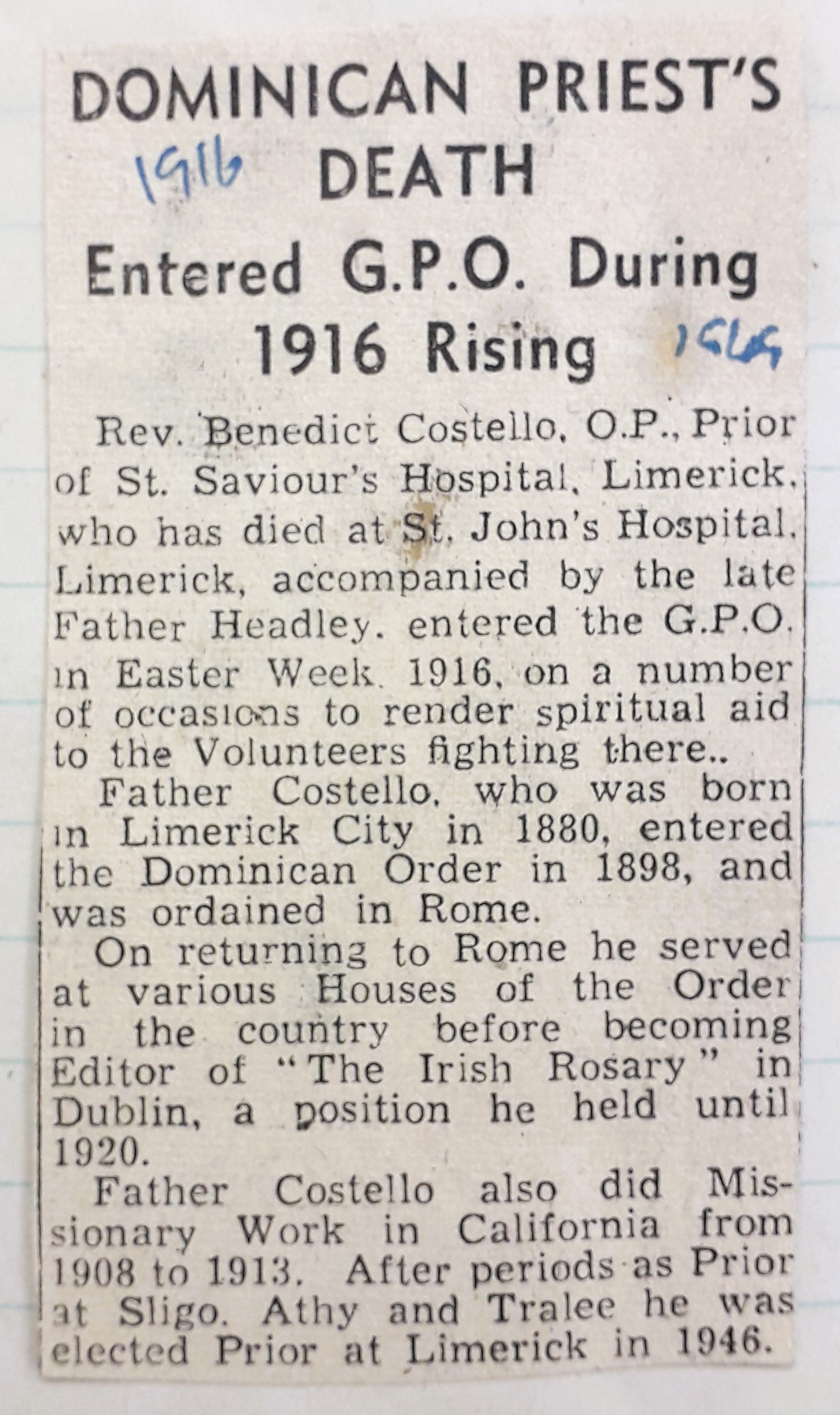 A clipping of an article reporting on the death of Fr. Benedict Costello OP, a Dominican friar, who entered the General Post Office on several occasions to minister to rebels during the 1916 Rising.