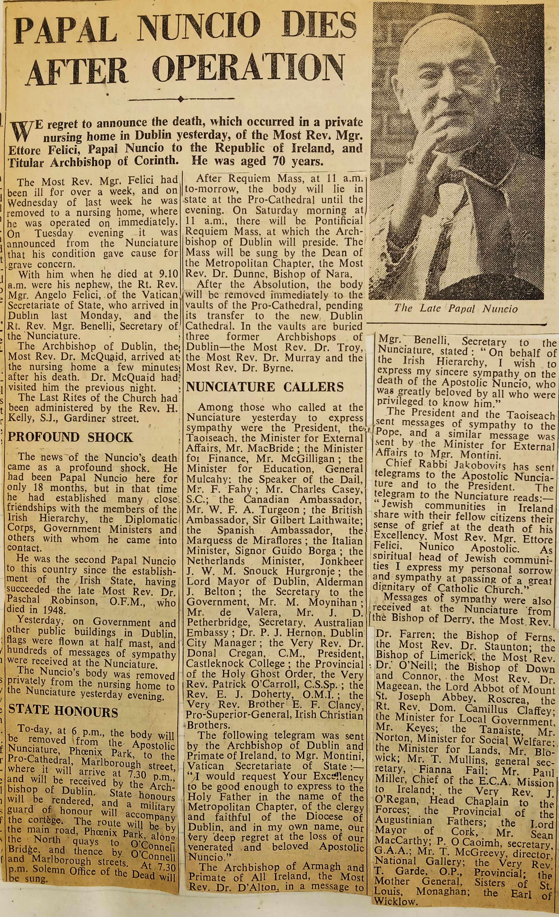 A clipping of an article reporting on the death of Monsignor Ettore Felici, Apostolic Nuncio to Ireland. The clipping is taken from the ‘Irish Times’ (10 May 1951).