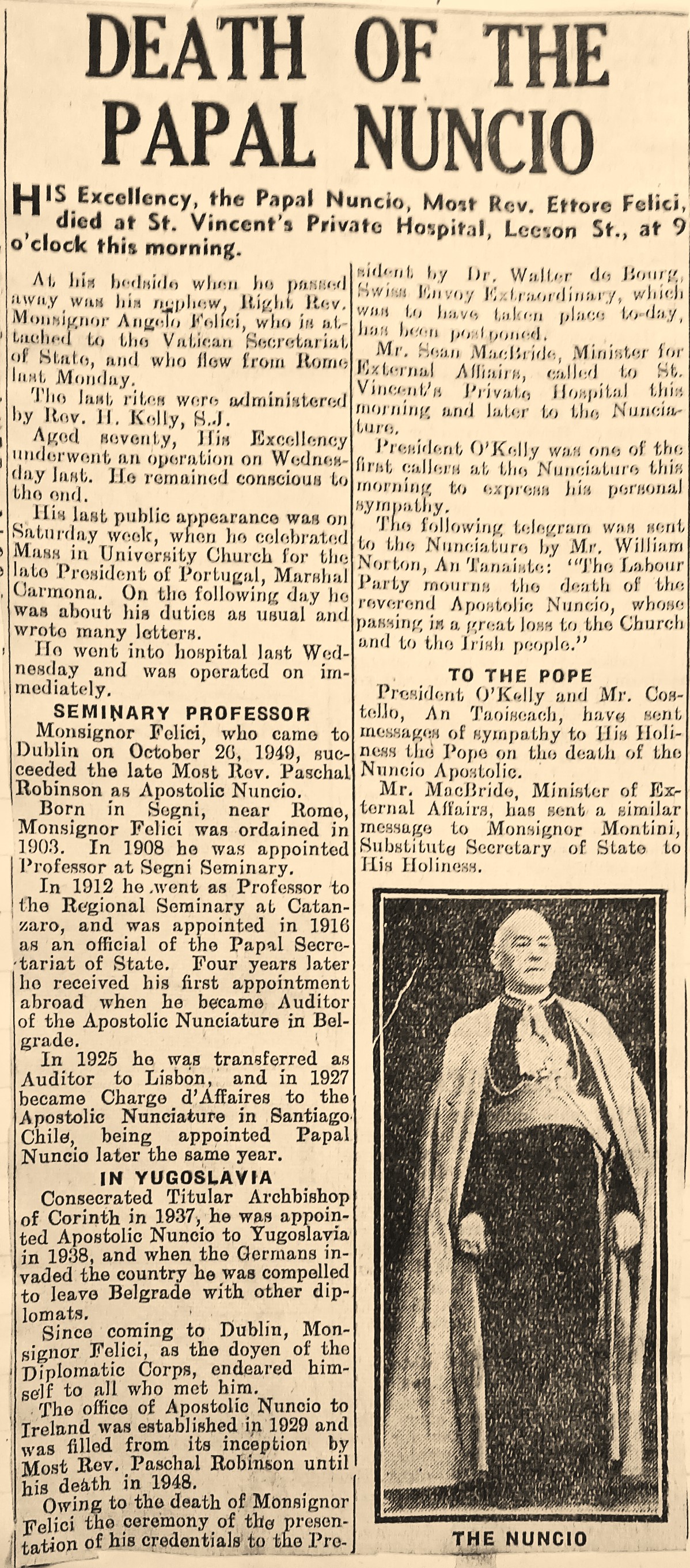 A clipping of an article reporting on the death of Monsignor Ettore Felici, Apostolic Nuncio to Ireland. The clipping is taken from the ‘Evening Mail’ (9 May 1951).