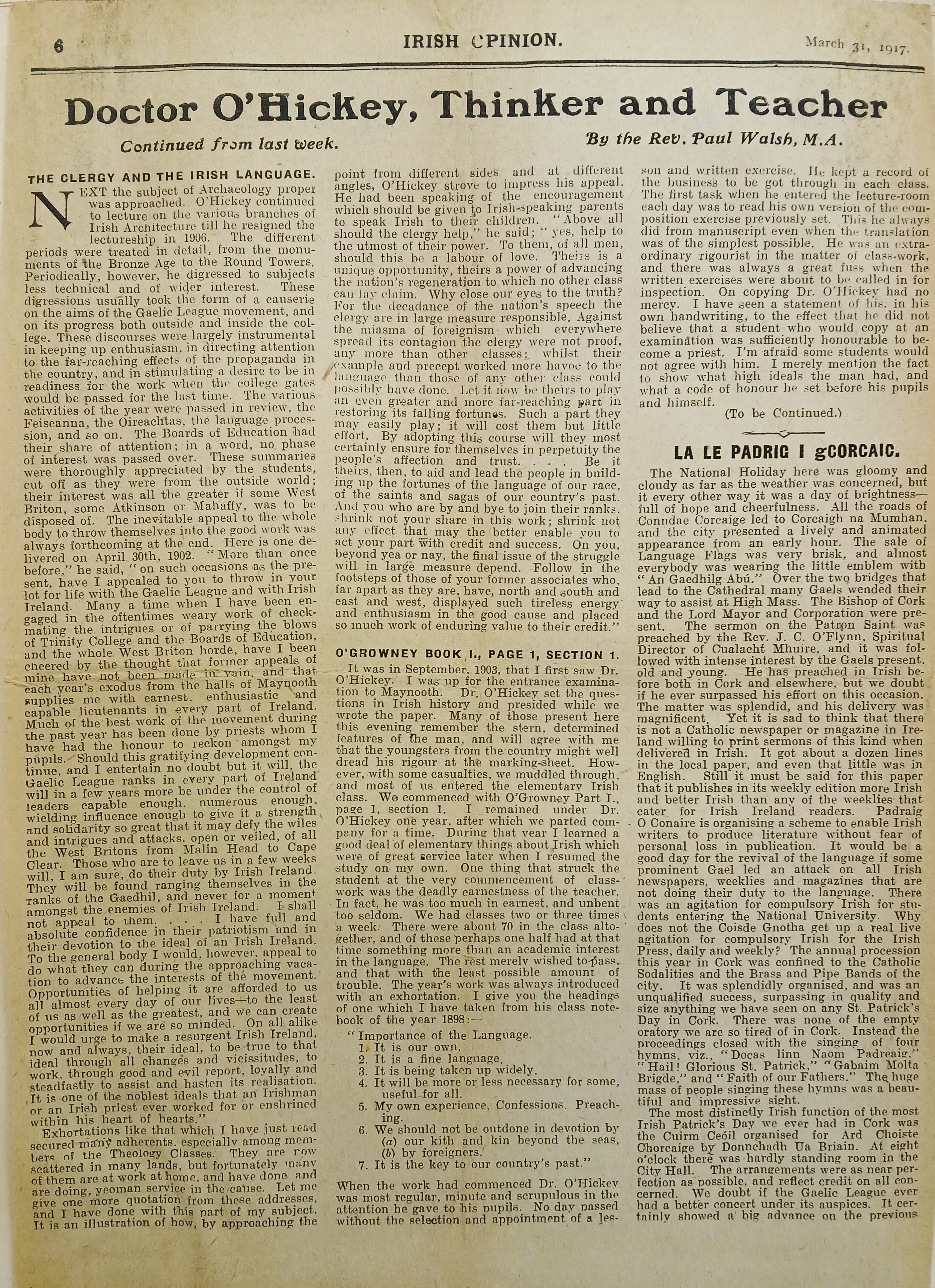A clipping of an article by the Rev. Paul Walsh reflecting on the life and literary career of Fr. Michael P. O’Hickey (An tAthair Micheál P. Ó hIceadha), an Irish priest, academic, and Irish language campaigner. The clipping is taken from ‘Irish Opinion’ (31 March 1917).