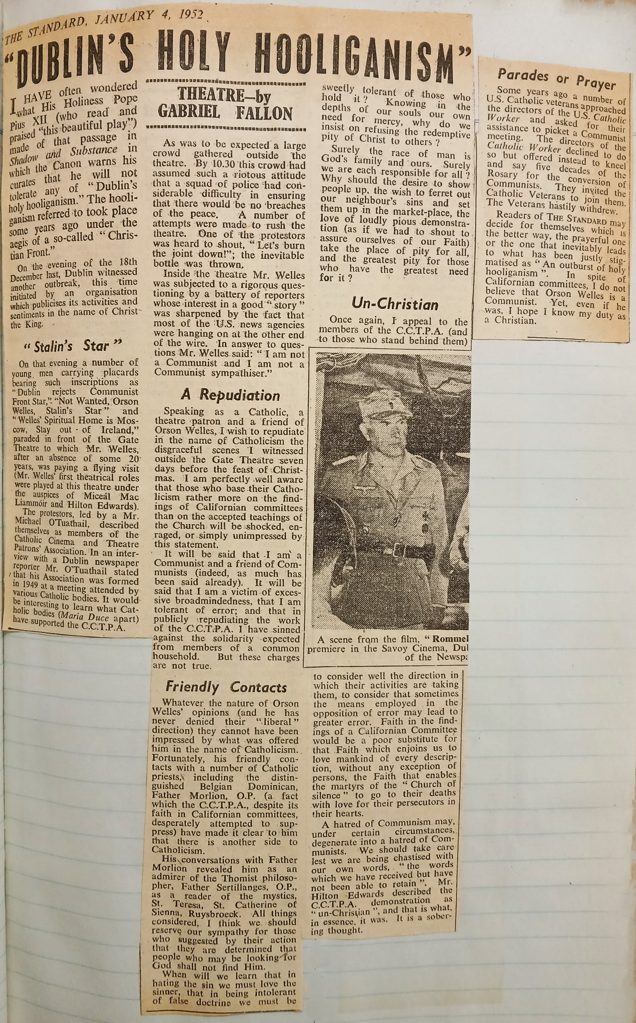 A clipping of an article by Gabriel Fallon criticising the protests which marked the appearance of Orson Welles at the Gate Theatre in Dublin. Fallon repudiates the actions of the Catholic Cinema and Theatre Patrons’ Association who organized the protests. The clipping is taken from ‘The Standard’ (4 January 1952).