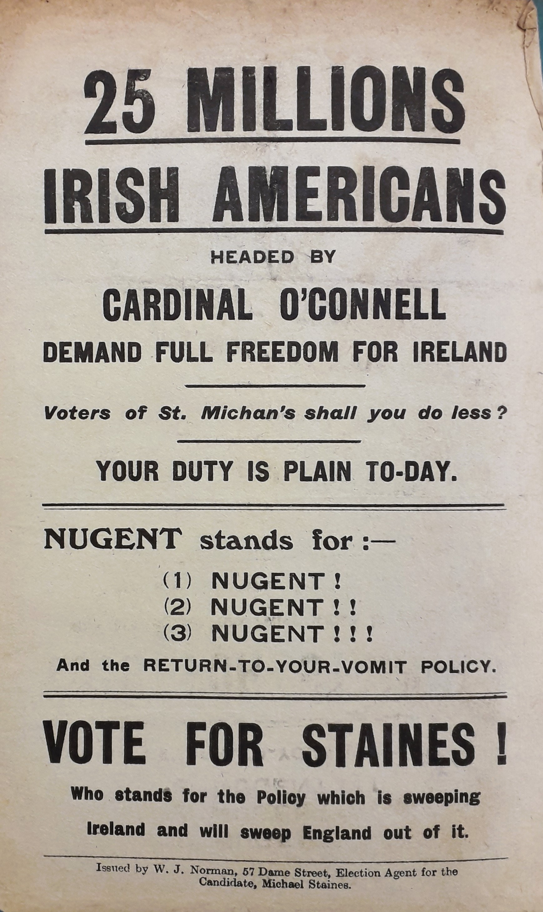 An election flier for Michael Staines for the Dublin St. Michan’s constituency at the 1918 general election. Staines was the Sinn Féin candidate, and he defeated John Dillon Nugent (Irish Parliamentary Party) in the contest. The flier was issued by W.J. Norman, 57 Dame Street, Staines’s election agent.