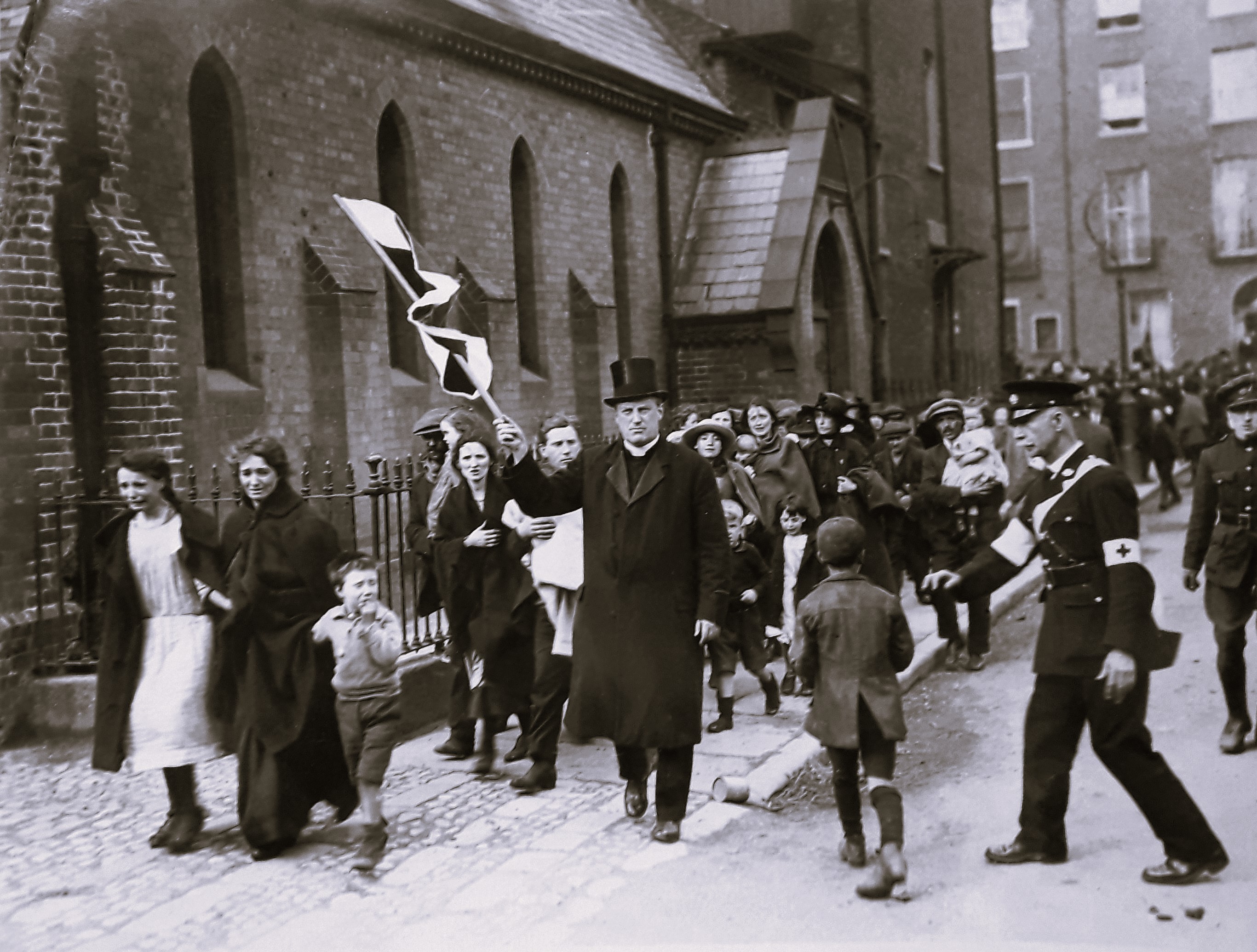 A photographic print of children and civilians being evacuated from the school on Gardiner Street in Dublin at the outset of the Civil War.