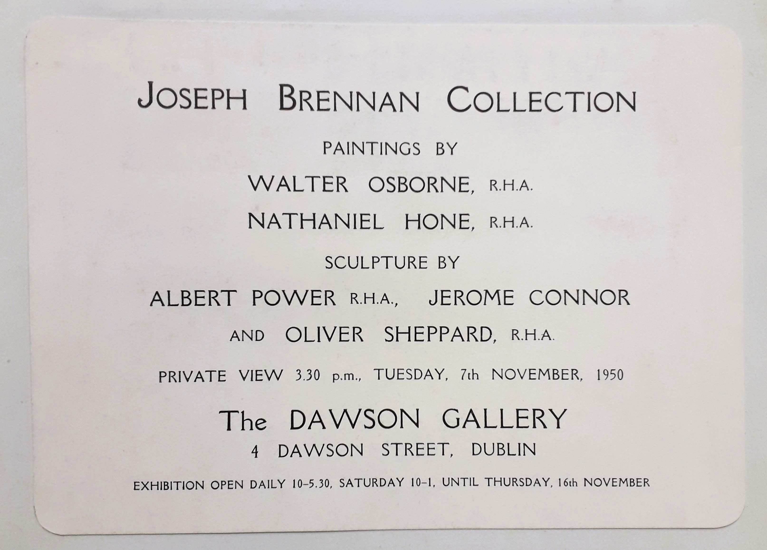 A card publicising an exhibition of art from the Joseph Brennan Collection at the Dawson Gallery in Dublin. The exhibition included sculptures by Albert Power and Jerome Connor and paintings by Walter Osborne and Nathaniel Hone.