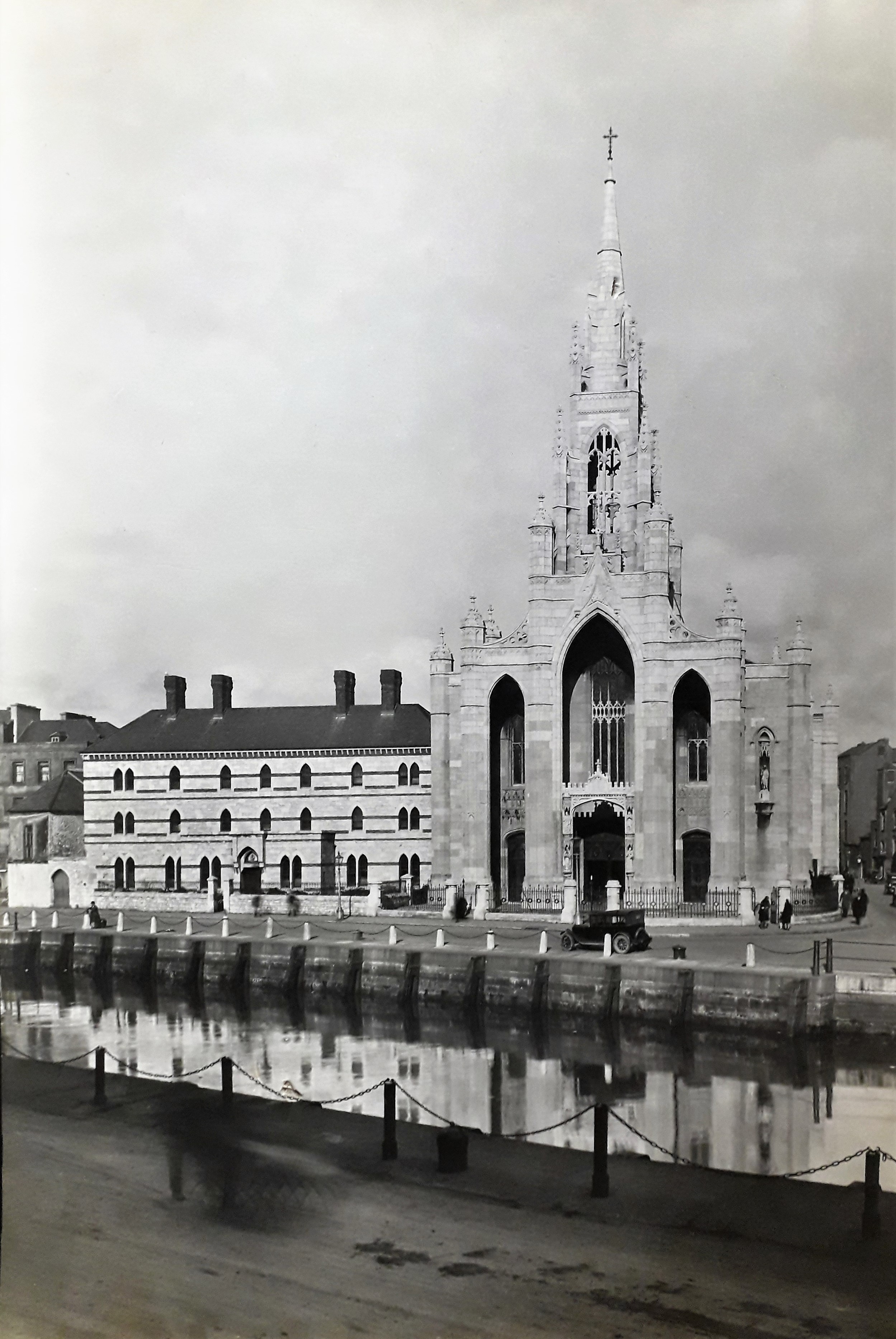 An image of the exterior of Holy Trinity Church on Father Mathew Quay viewed from the opposite bank of the South Channel of the River Lee in Cork.