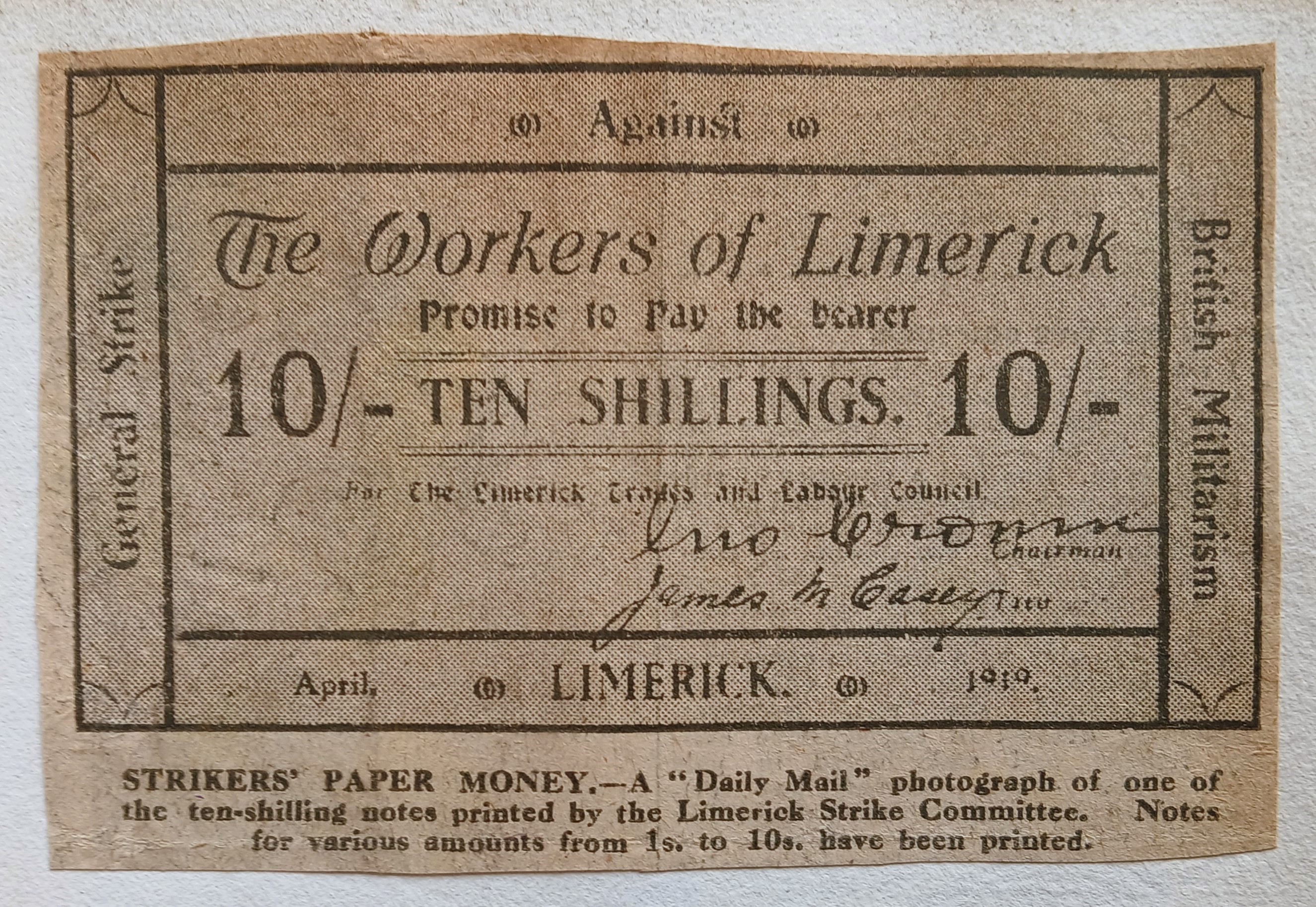 A clipping of a facsimile copy of a ten shilling note issued by the Limerick Soviet. The caption notes that the photograph was published in the ‘Daily Mail’ in 1919. The note carries the inscription around the edges: ‘General Strike Against British Militarism. Limerick April 1919’; and in the centre: ‘The Workers of Limerick promise to pay the bearer ten shillings for The Limerick Trades and Labour Council’. The note is signed by the chairman and treasurer.