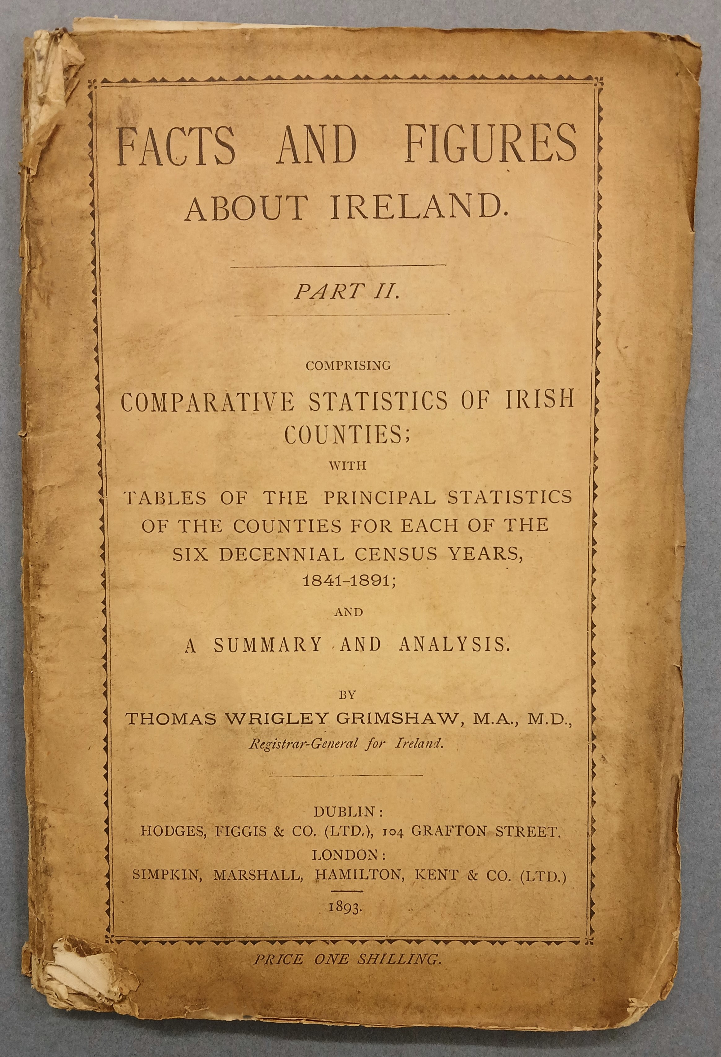 A copy of pamphlet titled ‘Facts and figures about Ireland / Part II … by Thomas Wrigley Grimshaw’ (Dublin: Hodges, Figgis, and Co., 1893).