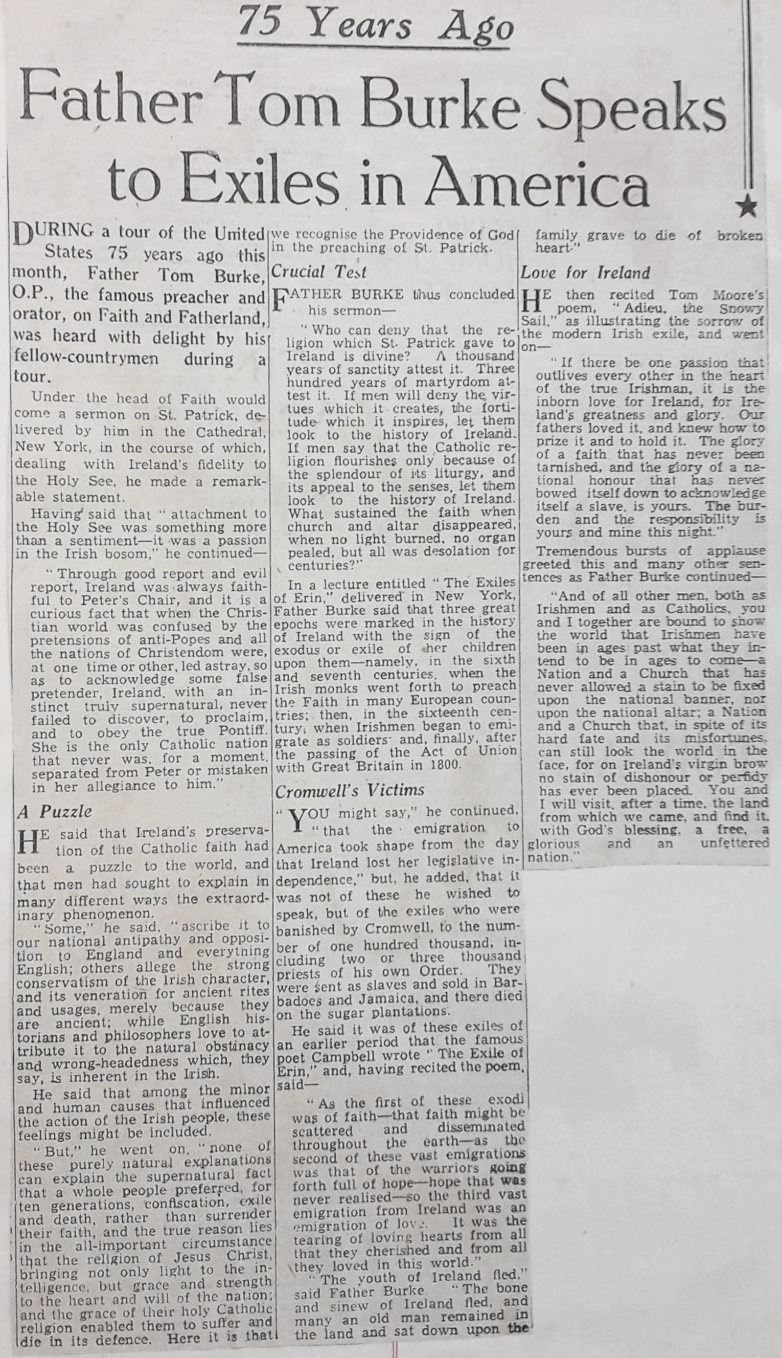 A clipping of an article reflecting on the American tour of Fr. Tom Burker OP, a noted Irish Dominican preacher and historian. Burke visited the United States in 1871. (Volume page 213).