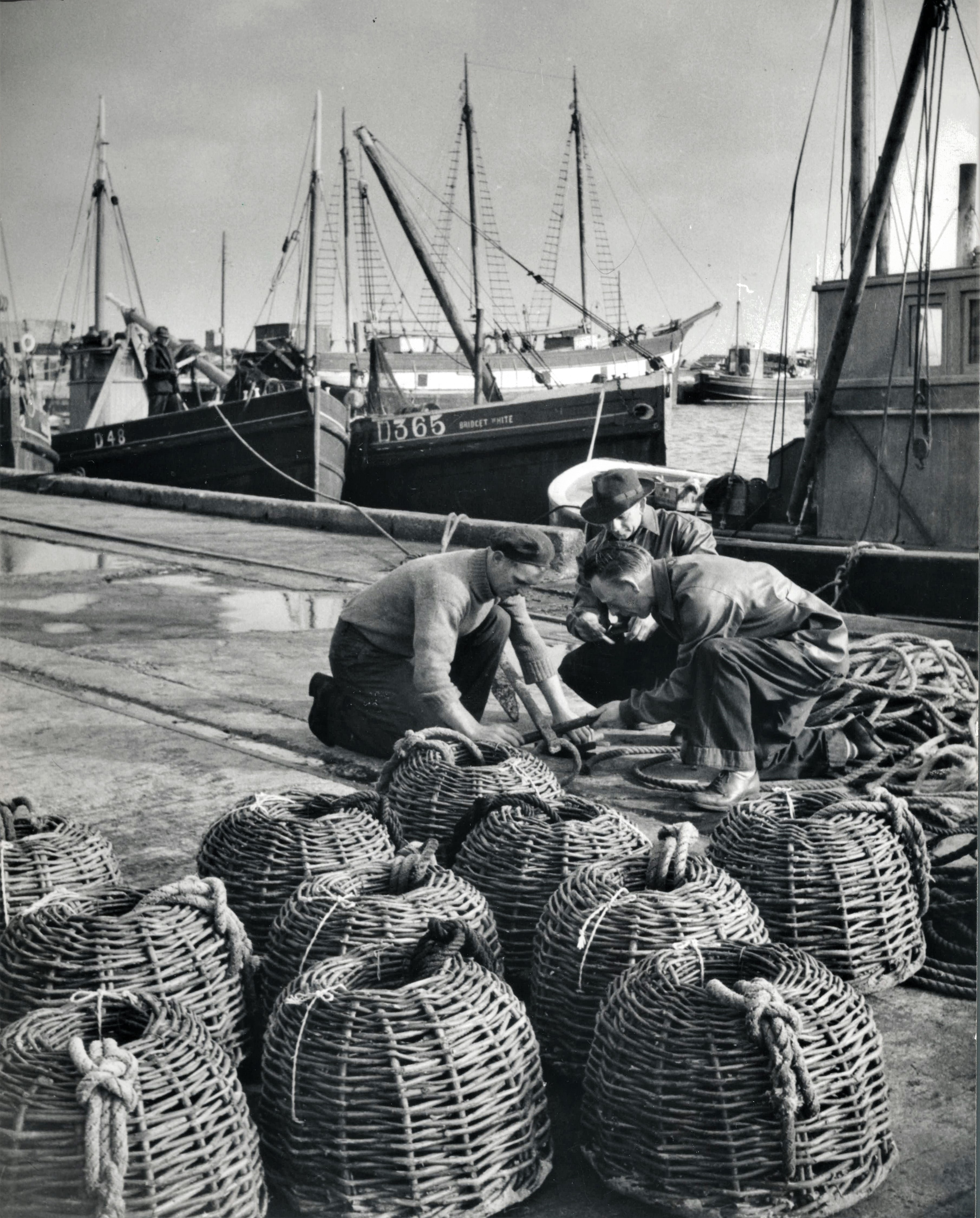 A view of fishermen at work on the quayside in Arklow Harbour in County Wicklow in about 1955.