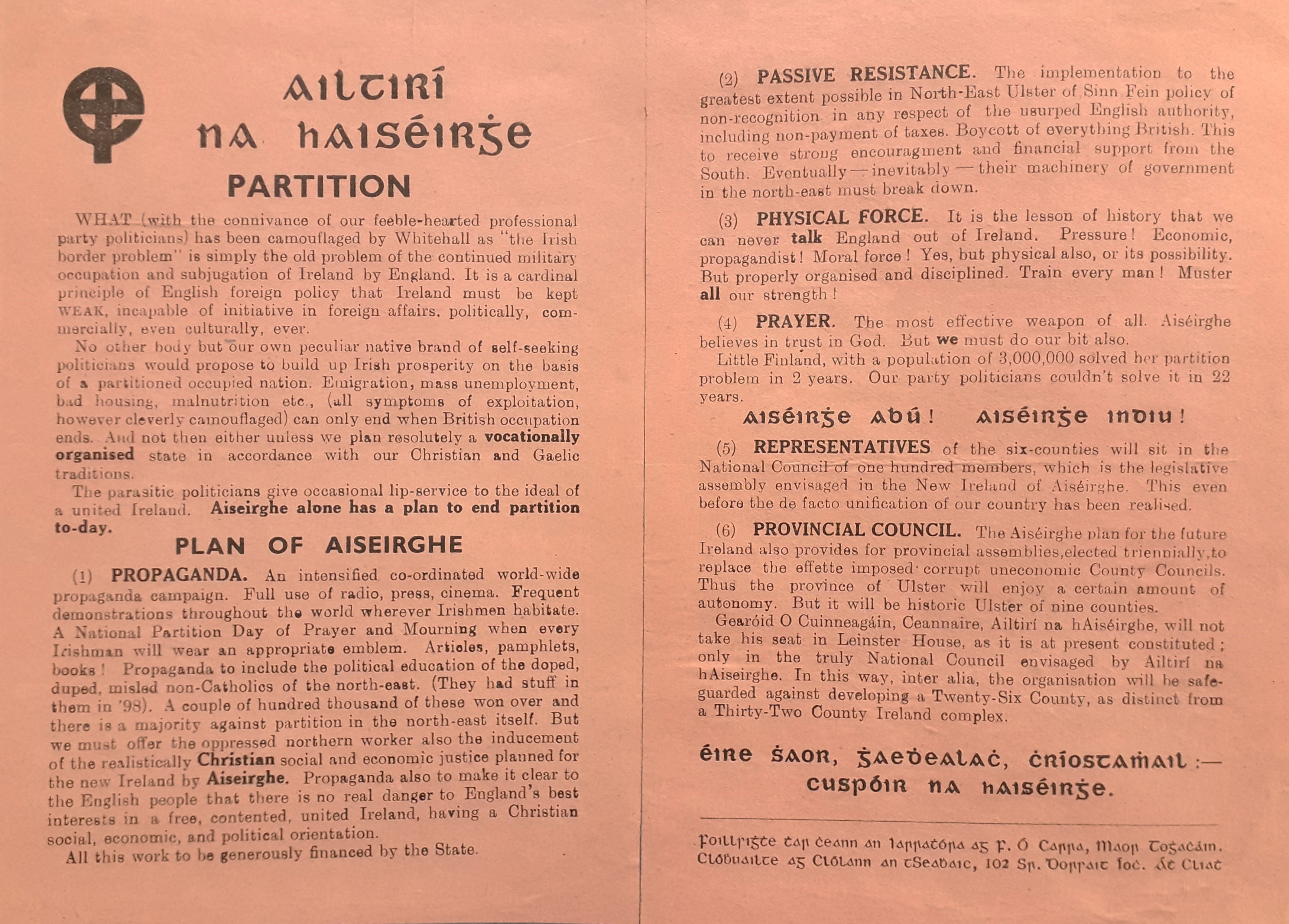 A printed flier from Ailtirí na hAiséirghe (‘architects of resurrection’) on the subject of partition. Includes references to the ideology of the party’s founder Gearóid Ó Cuinneagáin (1910-1991).