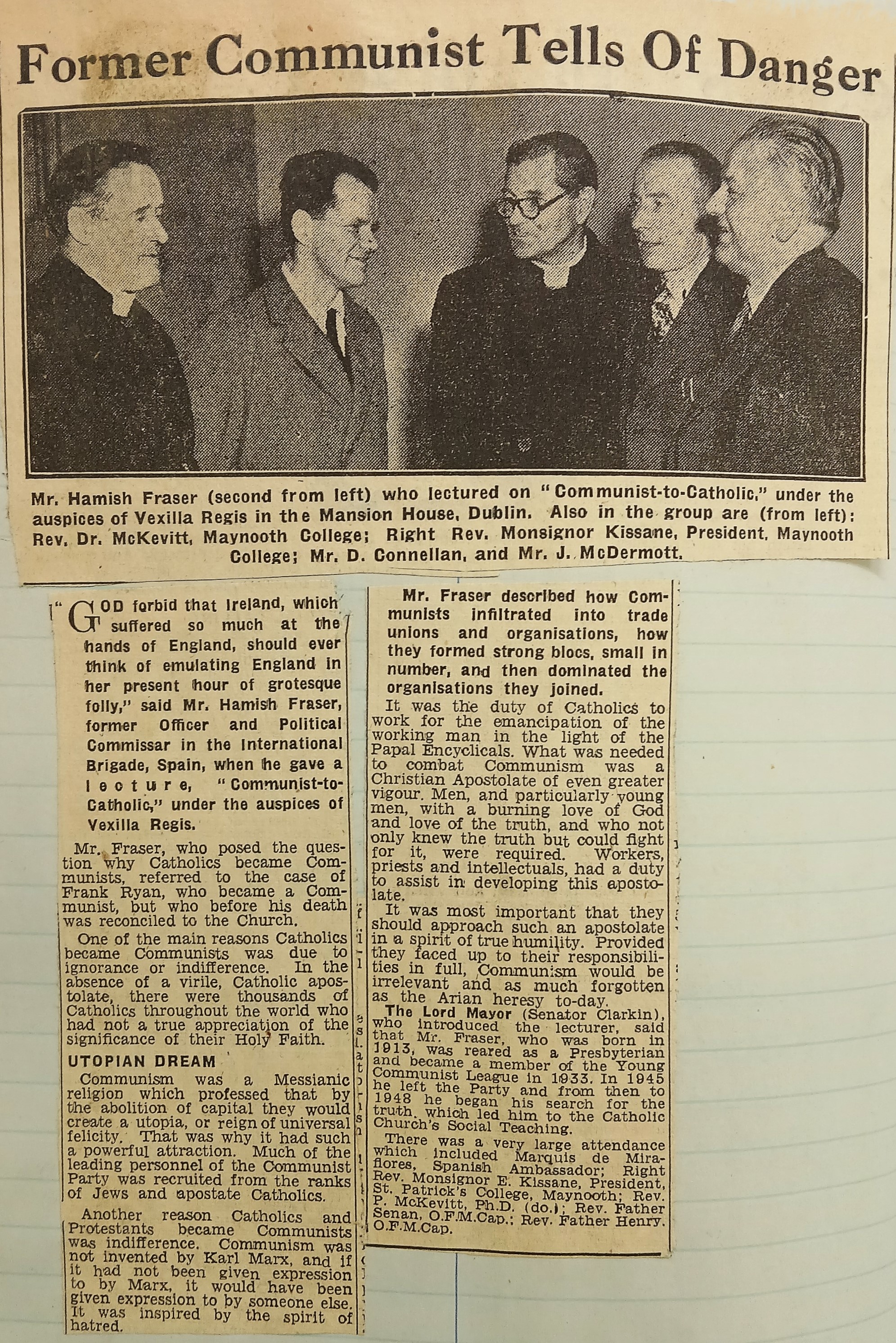 A clipping of an article reporting on Hamish Fraser’s lecture in the Mansion House in Dublin warning of the dangers of communism infiltration and giving an account of his own experiences as a former communist in Republican Spain. Fraser also refers to the experiences of Frank Ryan. It is noted that Fr. Senan Moynihan OFM Cap. was among the attendees at the event. The clipping is taken from the ‘Irish Independent’ (10 March 1952).