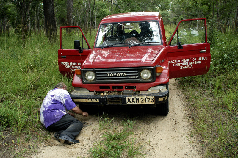 Fr. Kieran Shorten OFM Cap. repairing a puncture in a forest near Chinyingi Mission.