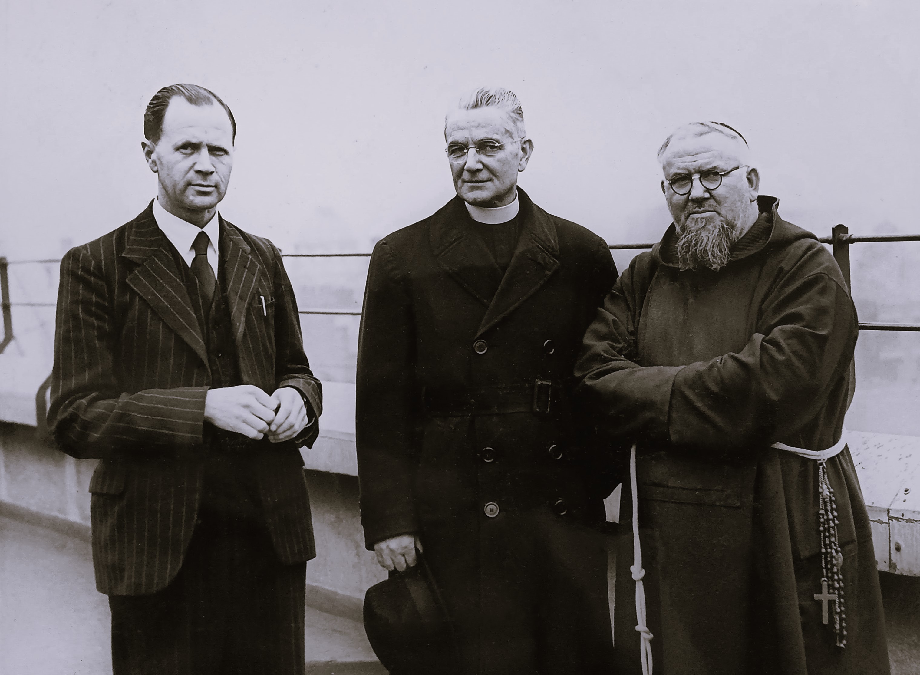 A photograph of Fr. Senan Moynihan OFM Cap. (right) with two unidentified individuals (one clerical and one lay).