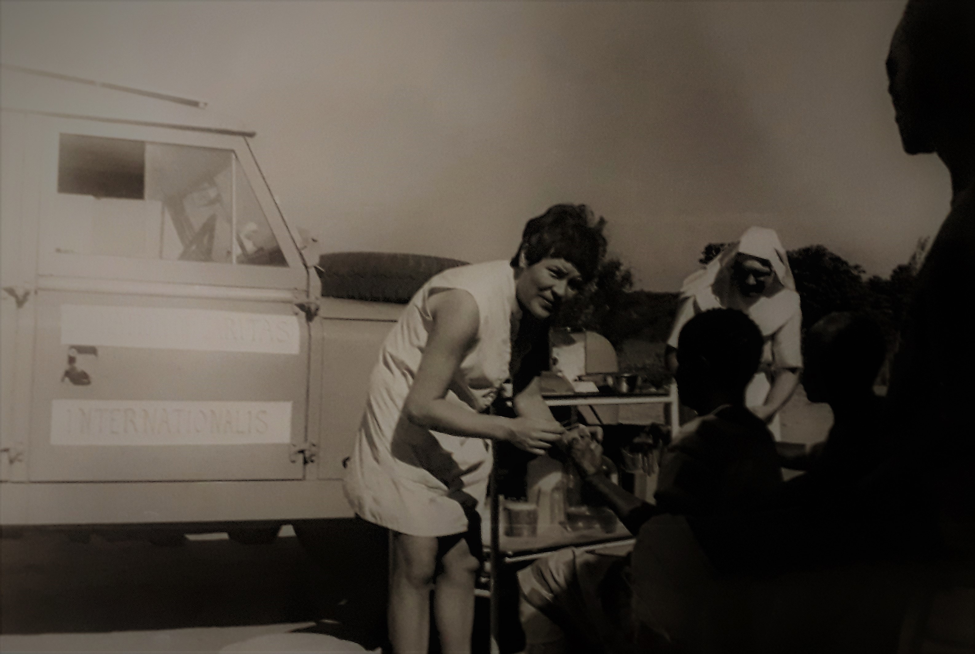 An outreach project from the Franciscan Missionaries of the Divine Motherhood (FMDM) at Mangango in Zambia. The image shows Dr Kathleen O’Connor with a leprosy patient. Sr Martha Murtagh is in the background.