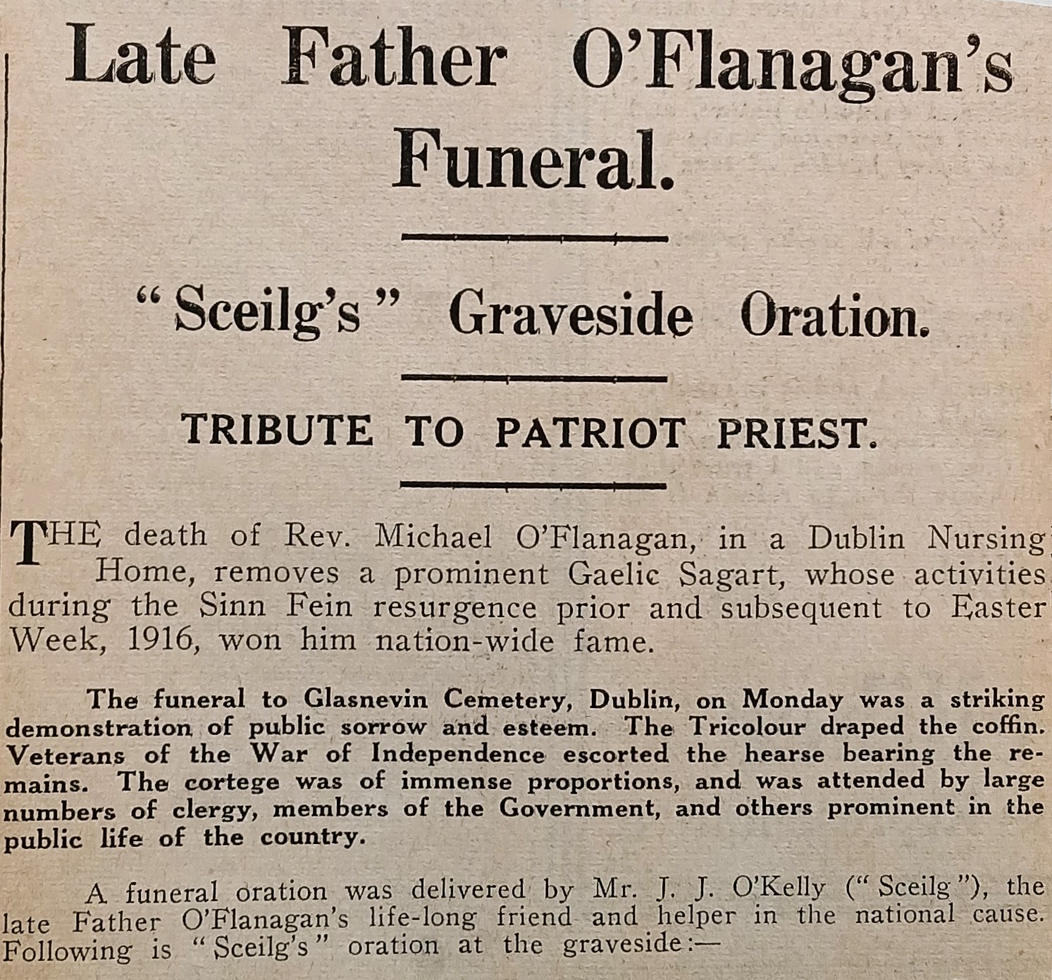 A clipping of an article reporting on the funeral of Fr. Mícheál Ó Flannagáin (Michael O’Flanagan) in Glasnevin Cemetery in Dublin. The clipping is taken from ‘The Kerryman’ (16 August 1942).