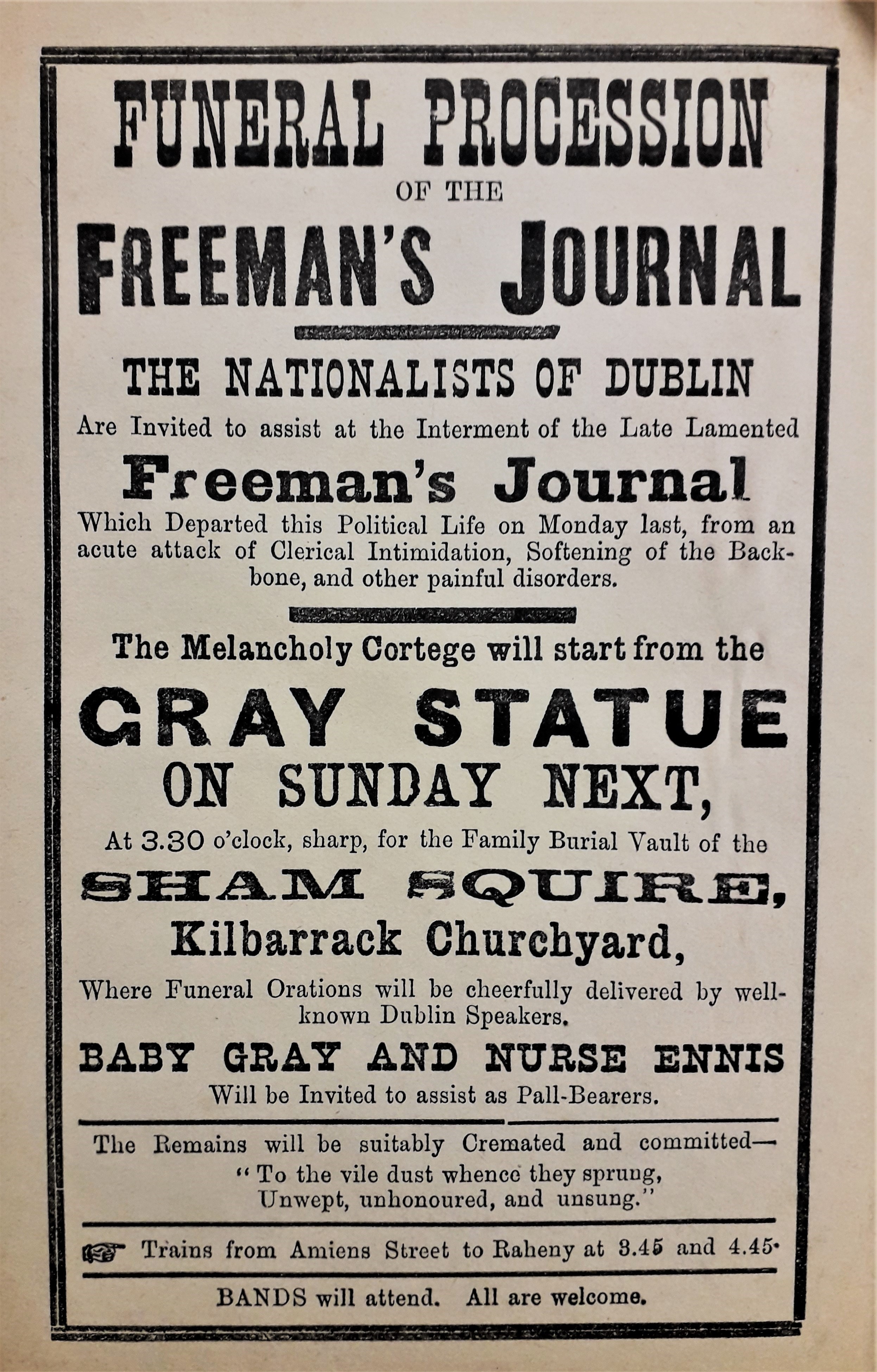 A satirical republican flier on the demise of the pro-Treaty 'Freeman's Journal' newspaper. The flier promotes a 'funeral procession' for the paper and notes that it ceased publication 'from an acute attack of Clerical Intimidation, Softening of the Back-bone, and other painful disorders'. Reference is made to the former proprietors of the newspaper, Francis Higgins (c.1745–1802), probably better known as the 'Sham Squire', and Sir John Gray (1815-1875).
