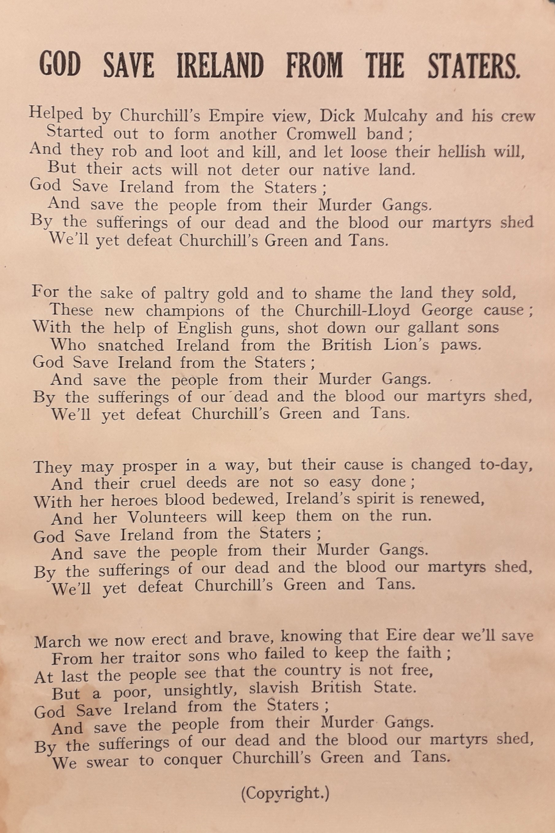 A republican flier titled ‘God save Ireland from the Staters’ criticising the military forces of the Free State and referring to them as ‘Churchill’s Green Tans’.