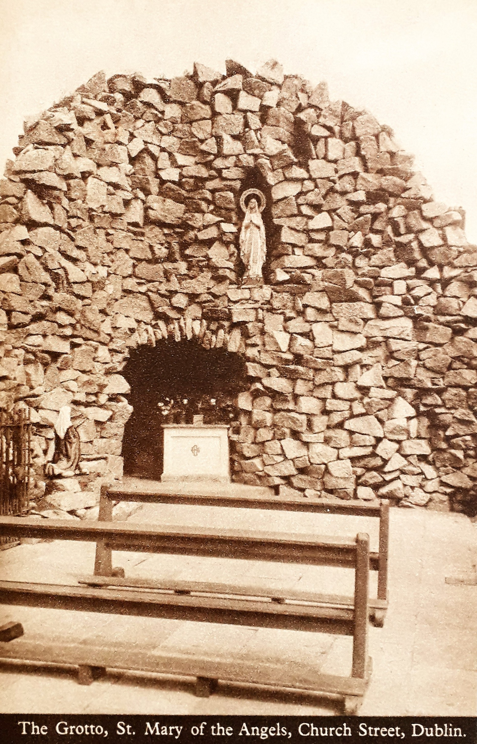 A pictorial postcard print of the Grotto at St. Mary of the Angels on Church Street in Dublin in about 1940.