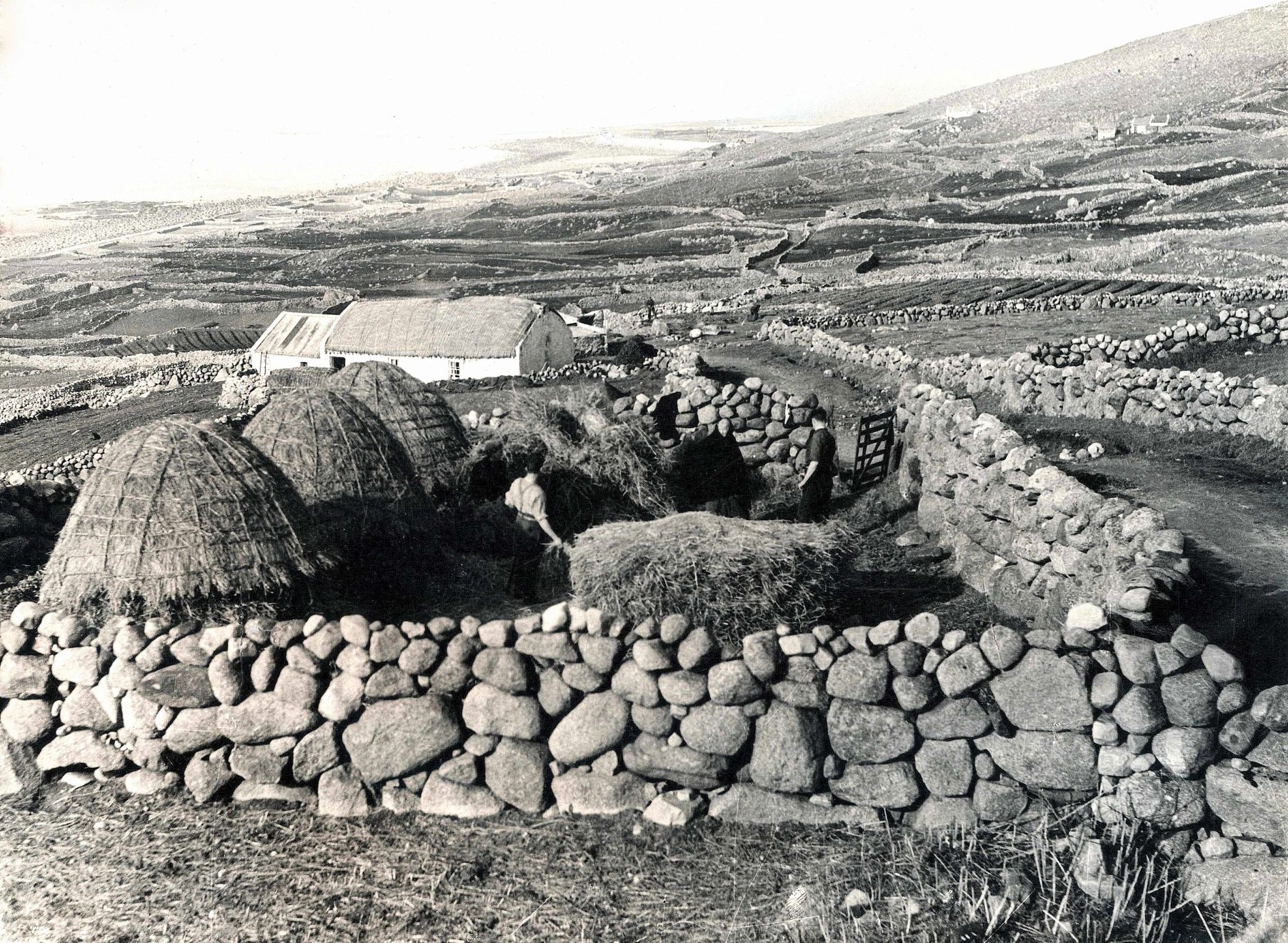 A view of harvesting in a traditional stone-walled landscape in County Donegal in about 1940.