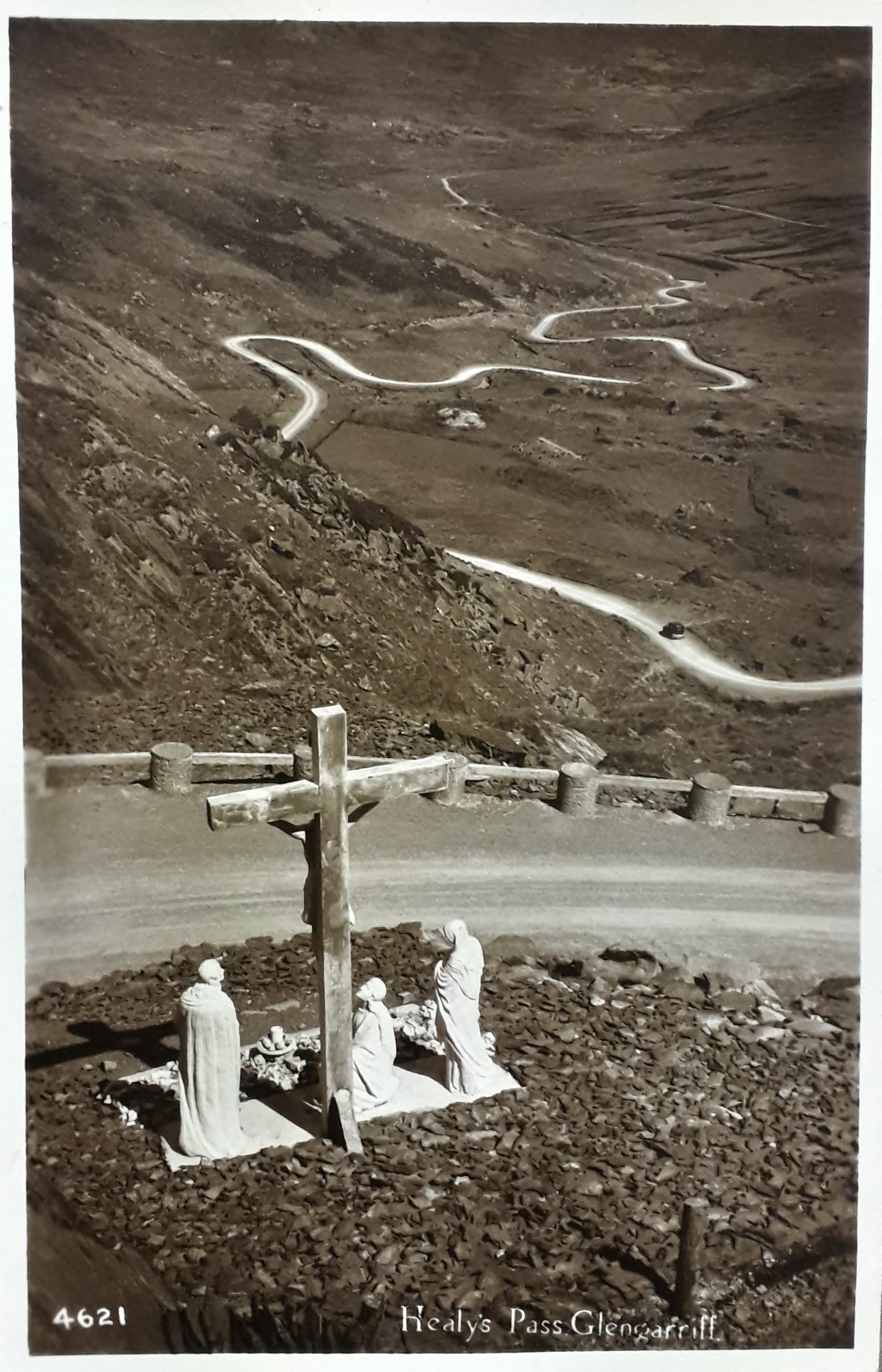 A postcard print image of the calvary monument in the Healy Pass near Glengarriff in County Cork.