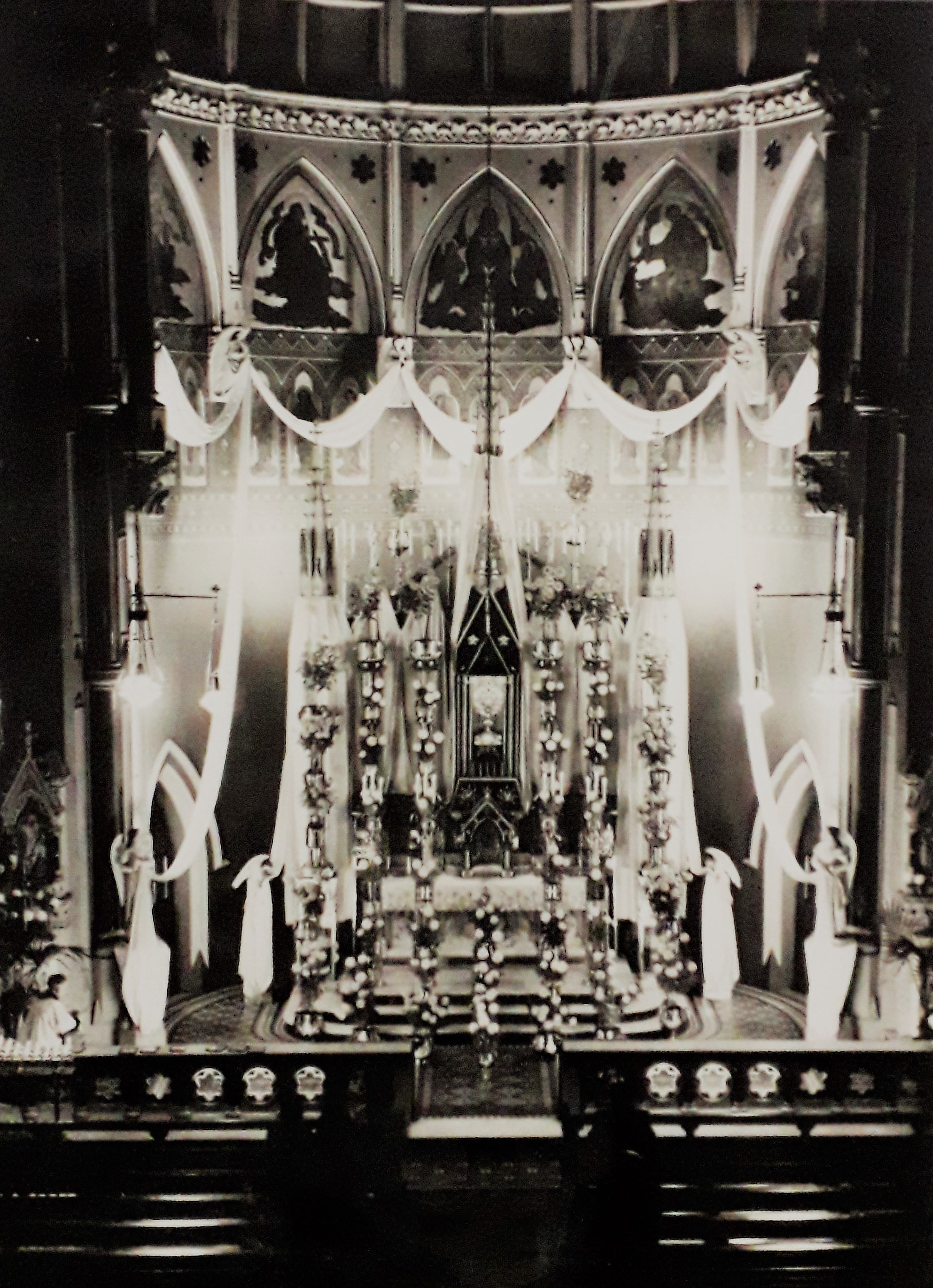 Photographic prints of the High Altar, St. Mary of the Angels, Church Street. The church and altar appear to be decorated for the Forty Hours’ Devotion ('Quarant’ Ore'). A wider view of the decorated church interior is pasted onto the reverse of one of the larger prints.