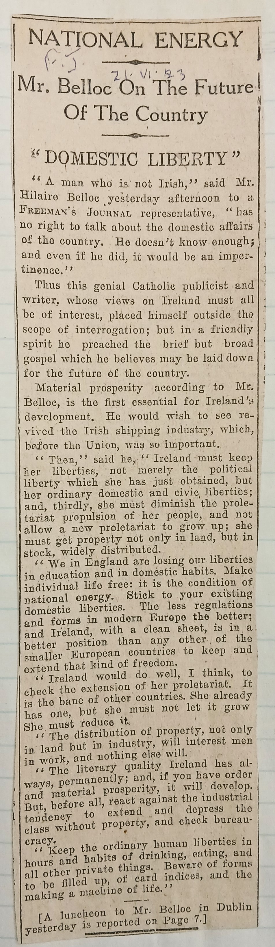 A clipping of an article reporting on the views of the writer and politician Hilaire Belloc with respect to Irish economic prospects and prosperity. The clipping is taken from the ‘Freeman’s Journal’ (21 June 1923).
