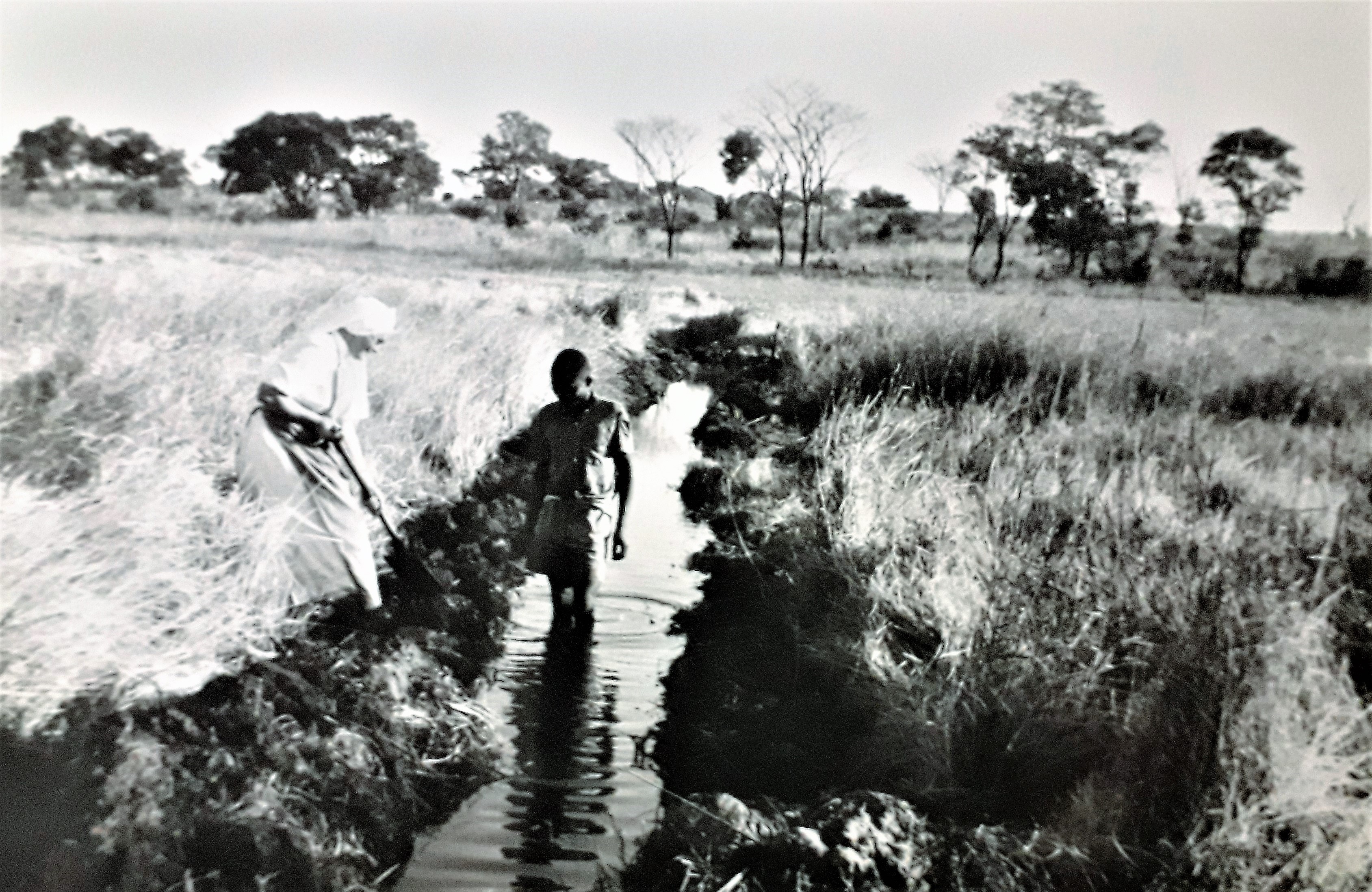 A Holy Cross sister working at the Kalabo Mission in Zambia. An annotation on the reverse reads 'Draining a swampy area and doing it together’.