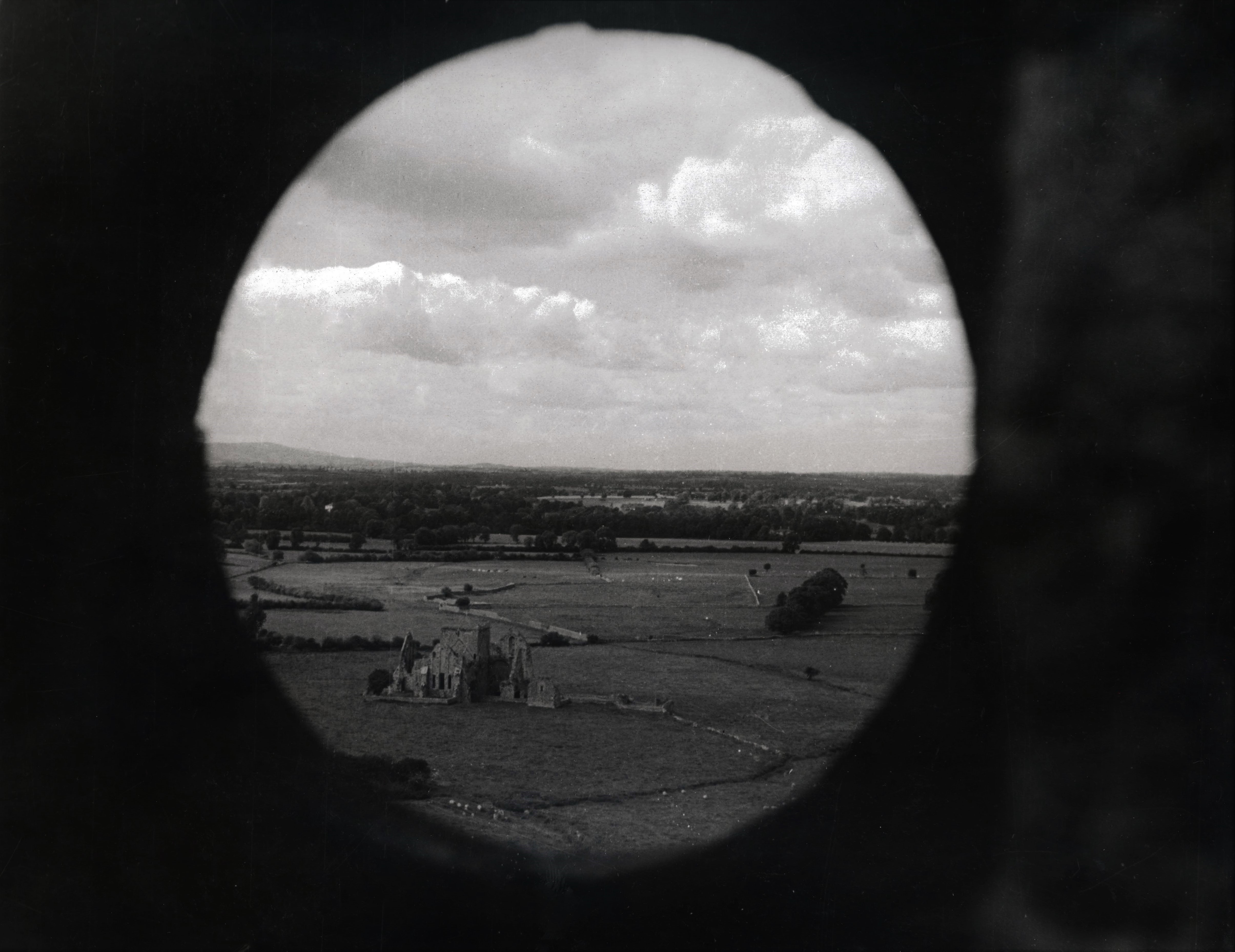An image of Hore Abbey (or Hoare Abbey, sometimes known as St. Mary's), a ruined Cistercian monastery in County Tipperary. A typescript annotation on the reverse reads 'Through the window of the Rock of Cashel / A snap through one of the round windows of the Rock of Cashel showing Hore Abbey in the left corner'.